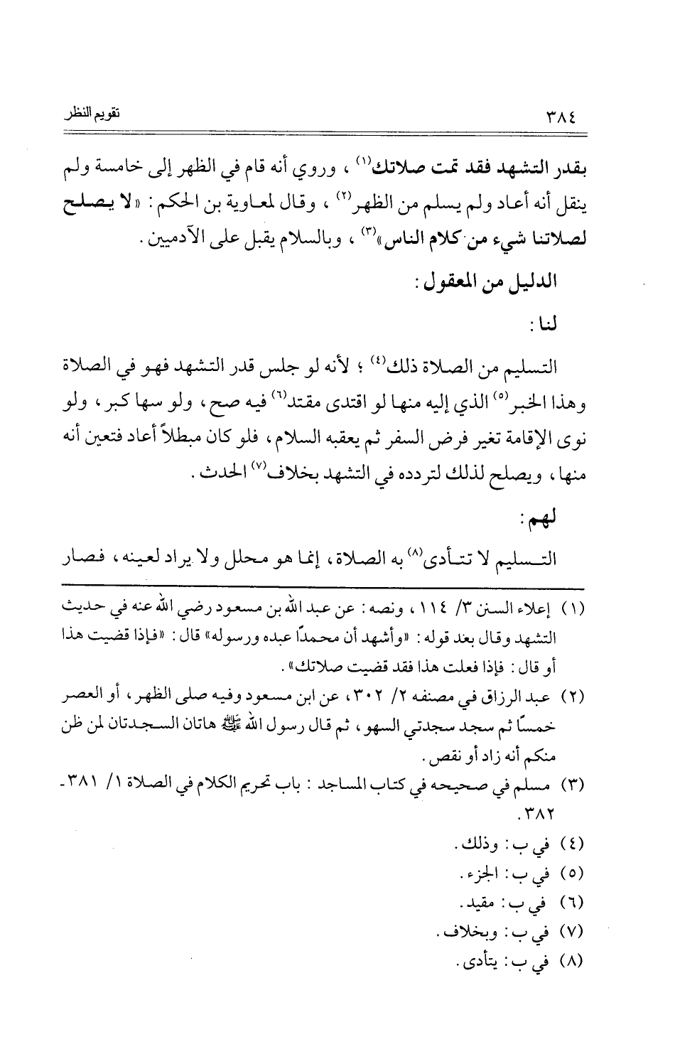 بِقدر التَّشَهُّد فقد تمت صَلَاتك، وَرُوِيَ أَنه قَامَ فِي الظّهْر إِلَى خَامِسَة وَلم ينْقل أَنه أعَاد وَلم يسلم من الظّهْر، وَقَالَ لمعاوية بن الحكم: " لَا يصلح لصلاتنا شَيْء من كَلَام النَّاس "، وبالسلام يقبل على الْآدَمِيّين.