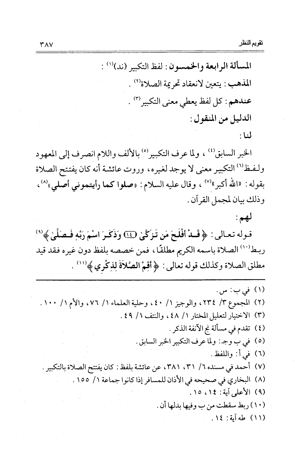 قَوْله تَعَالَى: {قد أَفْلح من تزكّى (14) وَذكر اسْم ربه فصلى} ربط الصَّلَاة باسمه الْكَرِيم مُطلقًا، فَمن خصصه بِلَفْظ دون غَيره فقد قيد مُطلق الصَّلَاة وَكَذَلِكَ قَوْله تَعَالَى: {أقِم الصَّلَاة لذكري} .