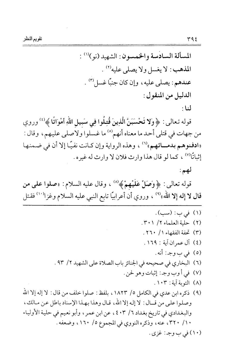 قَوْله تَعَالَى: {وَلَا تحسبن الَّذين قتلوا فِي سَبِيل الله أَمْوَاتًا} وَرُوِيَ من جِهَات فِي قَتْلَى أحد مَا مَعْنَاهُ أَنهم مَا غسلوا وَلَا صلى عَلَيْهِم، وَقَالَ: " ادفنوهم بدمائهم "، وَهَذِه الرِّوَايَة وَإِن كَانَت نفيا إِلَّا أَن فِي ضمنهَا إِثْبَاتًا، كَمَا لَو قَالَ هَذَا وَارِث فلَان لَا وَارِث لَهُ غَيره.