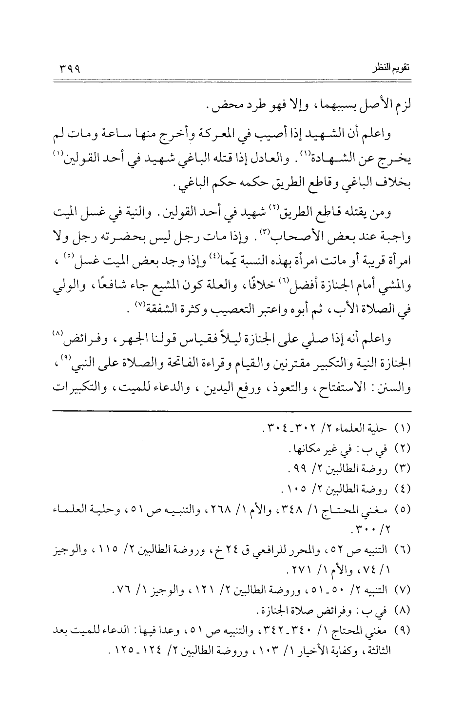 وَمن يقْتله قَاطع الطَّرِيق شَهِيد فِي أحد الْقَوْلَيْنِ. وَالنِّيَّة فِي غسل الْمَيِّت وَاجِبَة عِنْد بعض الْأَصْحَاب. وَإِذا مَاتَ رجل لَيْسَ بِحَضْرَتِهِ رجل وَلَا امْرَأَة قريبَة أَو مَاتَت امْرَأَة بِهَذِهِ النِّسْبَة يمما وَإِذا وجد بعض الْمَيِّت غسل، وَالْمَشْي أَمَام الْجِنَازَة أفضل خلافًا، وَالْعلَّة كَون المشيع جَاءَ شافعا، وَالْوَلِيّ فِي الصَّلَاة الْأَب، ثمَّ أَبوهُ وَاعْتبر التَّعْصِيب وَكَثْرَة الشَّفَقَة.