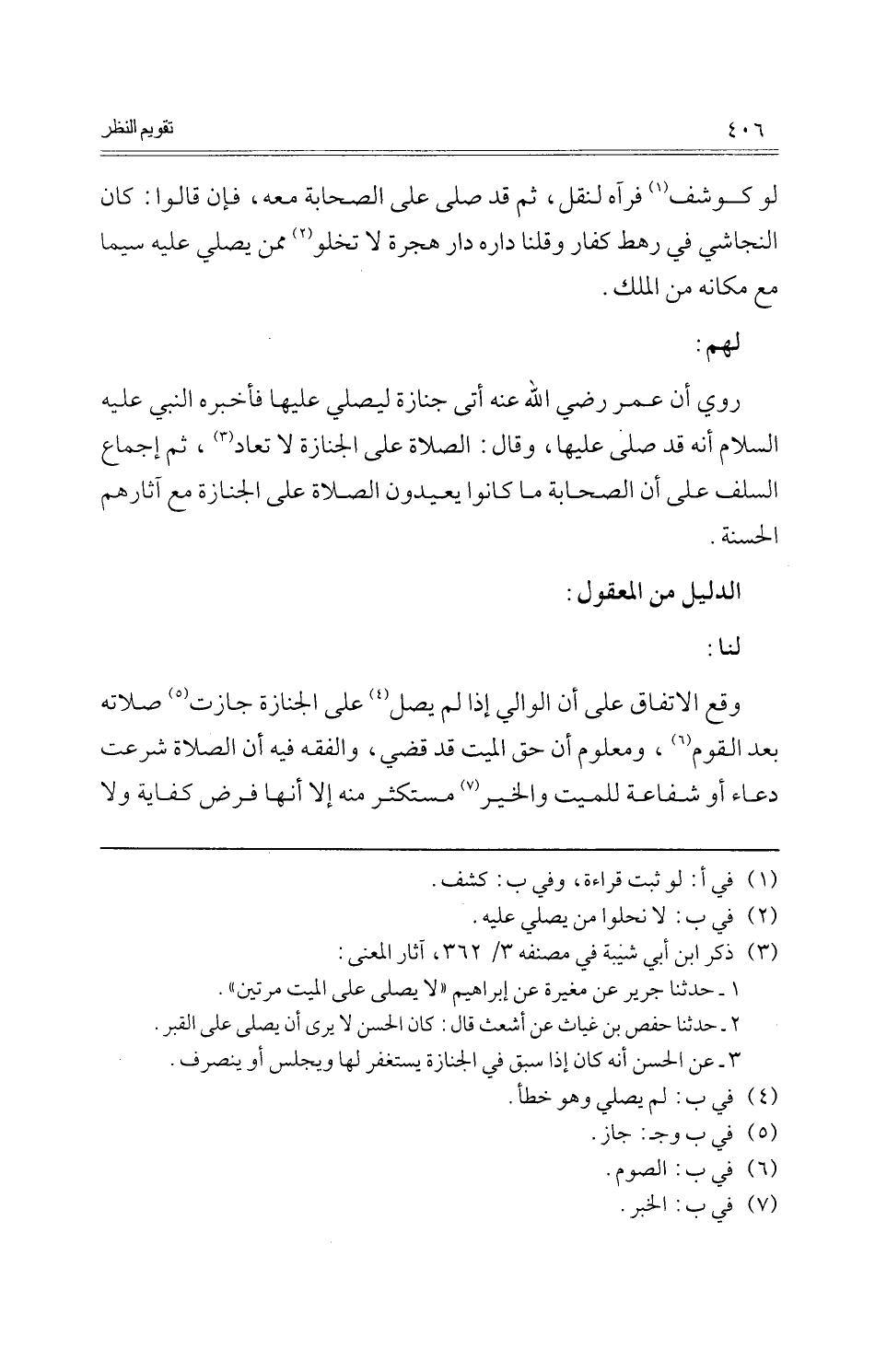 رُوِيَ أَن عمر رَضِي الله عَنهُ أَتَى جَنَازَة ليُصَلِّي عَلَيْهَا فَأخْبرهُ النَّبِي عَلَيْهِ السَّلَام أَنه قد صلى عَلَيْهَا، وَقَالَ: الصَّلَاة على الْجِنَازَة لَا تُعَاد، ثمَّ إِجْمَاع السّلف على أَن الصَّحَابَة مَا كَانُوا يعيدون الصَّلَاة على الْجِنَازَة مَعَ آثَارهم الْحَسَنَة.