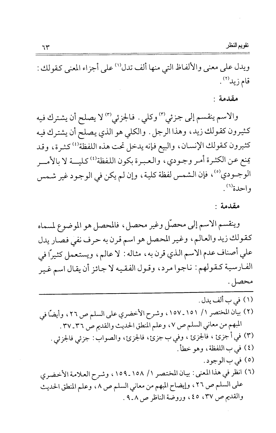 وَالِاسْم يَنْقَسِم إِلَى جزئي وكلي. فالجزئي لَا يصلح أَن يشْتَرك فِيهِ كَثِيرُونَ كَقَوْلِك زيد، وَهَذَا الرجل. والكلي هُوَ الَّذِي يصلح أَن يشْتَرك فِيهِ كَثِيرُونَ كَقَوْلِك الْإِنْسَان، وَالْبيع فَإِنَّهُ يدْخل تَحت هَذِه اللَّفْظَة كَثْرَة، وَقد يمْنَع عَن الْكَثْرَة أَمر وجودي، وَالْعبْرَة بِكَوْن اللَّفْظَة كُلية لَا بِالْأَمر الوجودي، فَإِن الشَّمْس لَفْظَة كُلية، وَإِن لم يكن فِي الْوُجُود غير شمس وَاحِدَة.