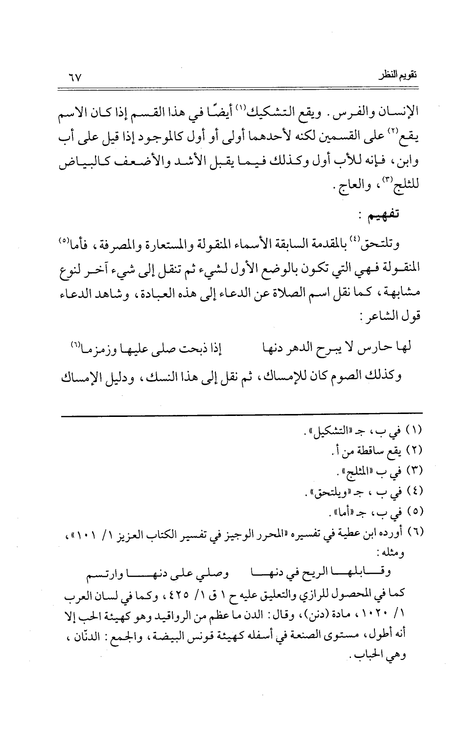 وتلتحق بالمقدمة السَّابِقَة الْأَسْمَاء المنقولة والمستعارة والمصرفة، فَأَما المنقولة فَهِيَ الَّتِي تكون بِالْوَضْعِ الأول لشَيْء ثمَّ تنقل إِلَى شَيْء آخر لنَوْع مشابهة، كَمَا نقل اسْم الصَّلَاة عَن الدُّعَاء إِلَى هَذِه الْعِبَادَة، وَشَاهد الدُّعَاء قَول الشَّاعِر:
