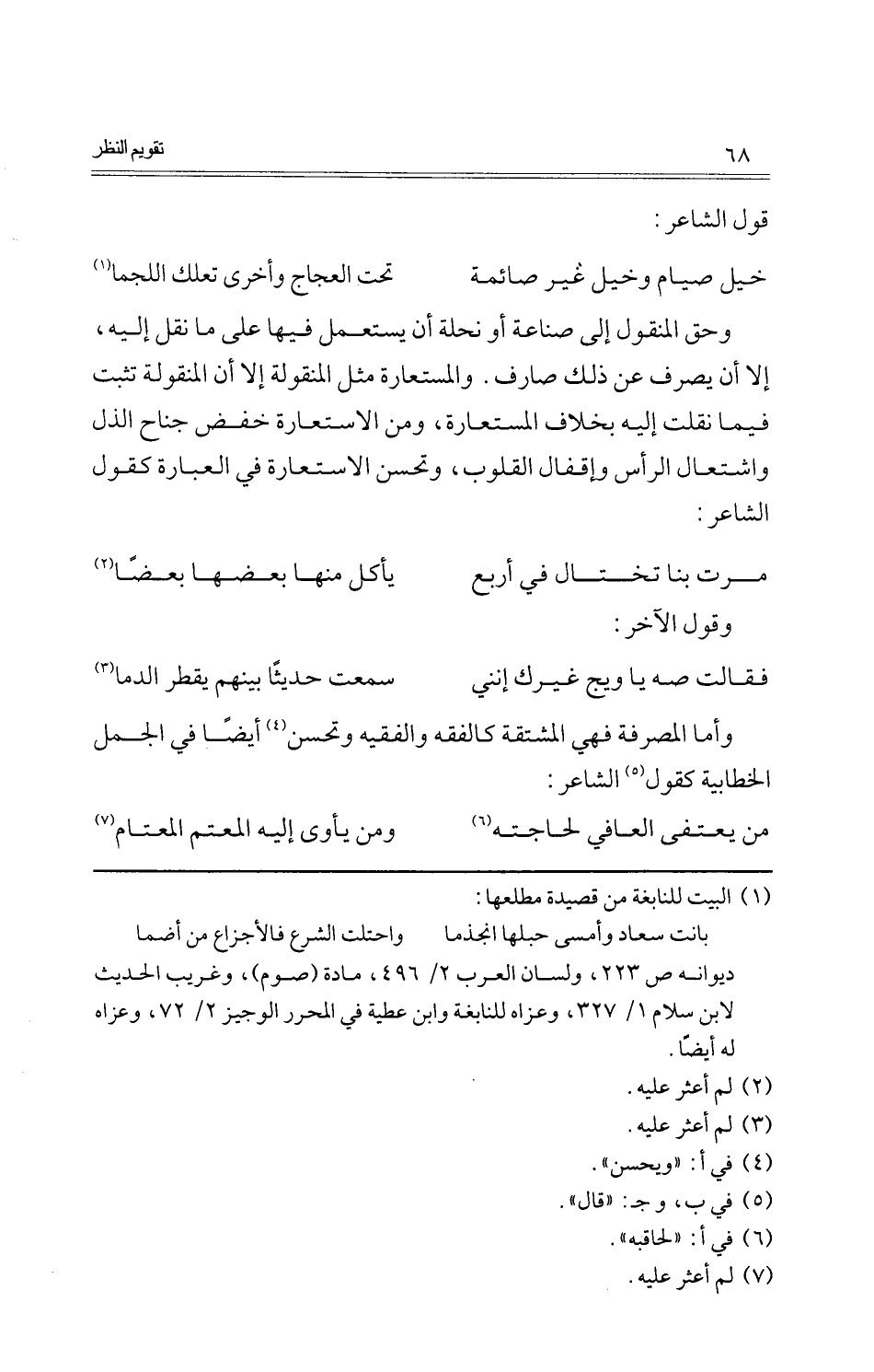 وَحقّ الْمَنْقُول إِلَى صناعَة أَو نحلة أَن يسْتَعْمل فِيهَا على مَا نقل إِلَيْهِ، إِلَّا أَن يصرف عَن ذَلِك صَارف. والمستعارة مثل المنقولة إِلَّا أَن المنقولة تثبت فِيمَا نقلت إِلَيْهِ بِخِلَاف المستعارة، وَمن الِاسْتِعَارَة خفض جنَاح الذل واشتعال الرَّأْس وإقفال الْقُلُوب، وتحسن الِاسْتِعَارَة فِي الْعبارَة كَقَوْل الشَّاعِر: