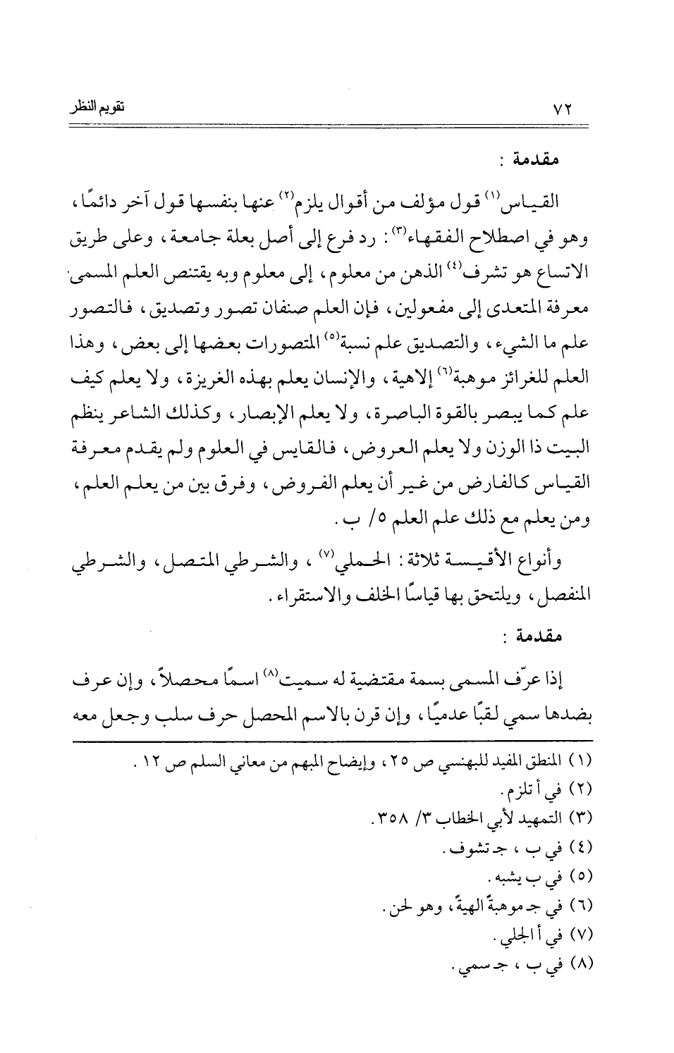 الْقيَاس قَول مؤلف من أَقْوَال يلْزم عَنْهَا بِنَفسِهَا قَول آخر دَائِما، وَهُوَ فِي اصْطِلَاح الْفُقَهَاء: رد فرع إِلَى أصل بعلة جَامِعَة، وعَلى طَرِيق الاتساع هُوَ تشرف الذِّهْن من مَعْلُوم، إِلَى مَعْلُوم وَبِه يقتنص الْعلم الْمُسَمّى معرفَة المتعدى إِلَى مفعولين، فَإِن الْعلم صنفان تصور وتصديق، فالتصور علم مَا الشَّيْء، والتصديق علم نِسْبَة المتصورات بَعْضهَا إِلَى بعض؛ وَهَذَا الْعلم للغرائز موهبة إلاهية، وَالْإِنْسَان يعلم بِهَذِهِ الغريزة، وَلَا يعلم كَيفَ علم كَمَا يبصر بِالْقُوَّةِ الباصرة، وَلَا يعلم الإبصار، وَكَذَلِكَ الشَّاعِر ينظم الْبَيْت ذَا الْوَزْن وَلَا يعلم الْعرُوض، فالقايس فِي الْعُلُوم وَلم يقدم معرفَة الْقيَاس كالفارض من غير أَن يعلم الْفُرُوض، وَفرق بَين من يعلم الْعلم، وَمن يعلم مَعَ ذَلِك علم الْعلم.