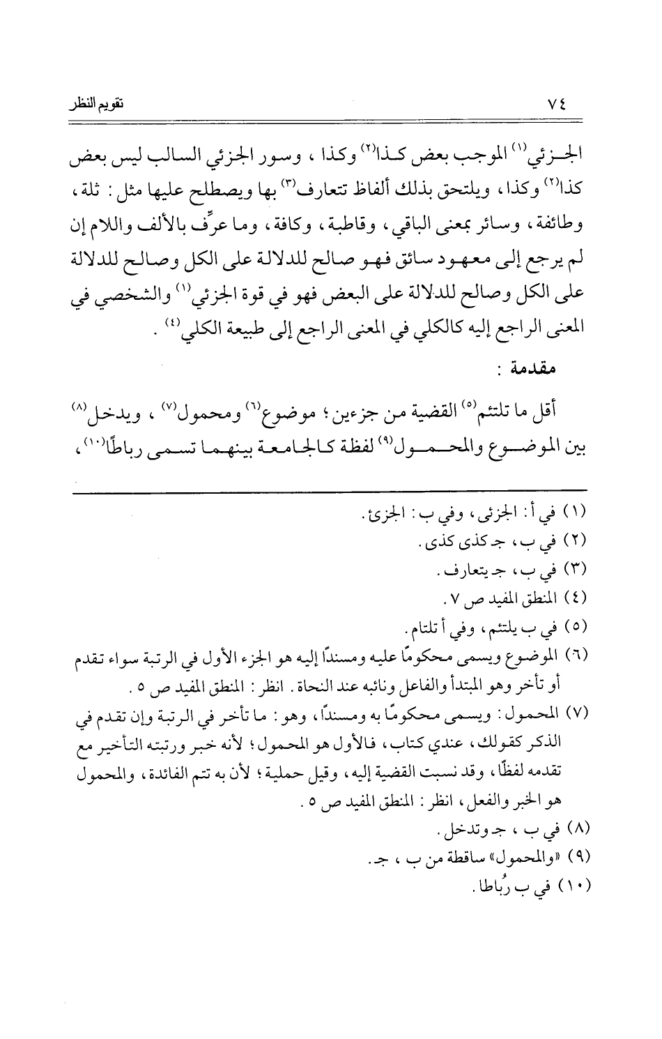 أقل مَا تلتئم الْقَضِيَّة من جزءين؛ مَوْضُوع ومحمول، وَيدخل بَين الْمَوْضُوع والمحمول لفظ كالجامعة بَينهمَا تسمى رِبَاطًا،
