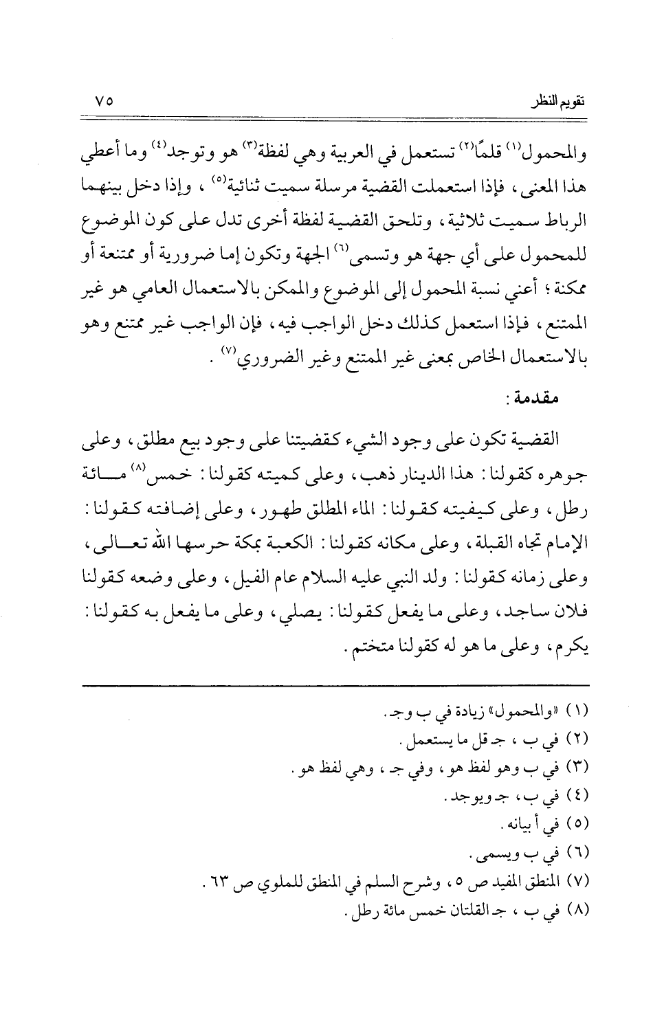 والمحمول قَلما تسْتَعْمل فِي الْعَرَبيَّة وَهِي لَفْظَة هُوَ وتوجد وَمَا أعطي هَذَا الْمَعْنى، فَإِذا اسْتعْملت الْقَضِيَّة مُرْسلَة سميت ثنائية، وَإِذا دخل بَينهمَا الرِّبَاط سميت ثلاثية، وتلحق الْقَضِيَّة لَفْظَة أُخْرَى تدل على كَون الْمَوْضُوع للمحمول على أَي جِهَة هُوَ وَتسَمى الْجِهَة وَتَكون إِمَّا ضَرُورِيَّة أَو ممتنعة أَو مُمكنَة؛ أَعنِي نِسْبَة الْمَحْمُول إِلَى الْمَوْضُوع والممكن بِالِاسْتِعْمَالِ الْعَاميّ هُوَ غير الْمُمْتَنع، فَإِذا اسْتعْمل كَذَلِك دخل الْوَاجِب فِيهِ، فَإِن الْوَاجِب غير مُمْتَنع وَهُوَ بِالِاسْتِعْمَالِ الْخَاص بِمَعْنى غير الْمُمْتَنع وَغير الضَّرُورِيّ.