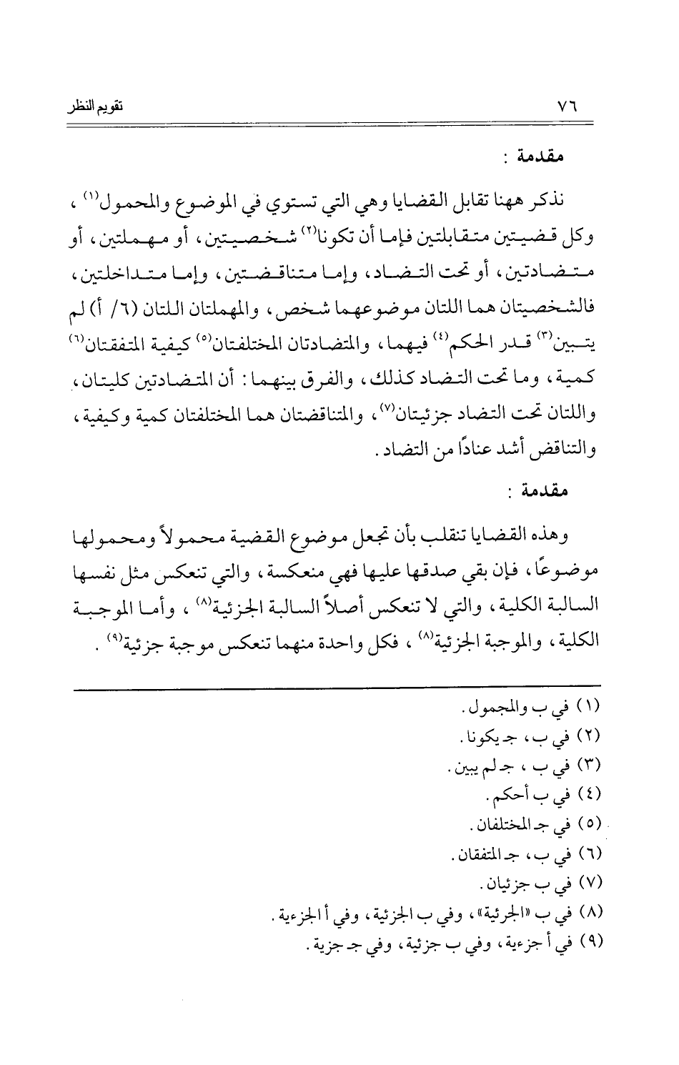 نذْكر هَهُنَا تقَابل القضايا وَهِي الَّتِي تستوي فِي الْمَوْضُوع والمحمول، وكل قضيتين متقابلتين فإمَّا أَن تَكُونَا شخصيتين، أَو مهملتين، أَو متضادتين، أَو تَحت التضاد، وَإِمَّا متناقضتين، وَإِمَّا متداخلتين، فالشخصيتان هما اللَّتَان موضوعهما شخص، والمهملتان اللَّتَان لم يتَبَيَّن قدر الحكم فيهمَا، والمتضادتان المختلفتان كَيْفيَّة المتفقتان كمية، وَمَا تَحت التضاد كَذَلِك، وَالْفرق بَينهمَا: أَن المتضادتين كليتان، واللتان تَحت التضاد جزئيتان، والمتناقضتان هما المختلفتان كمية وَكَيْفِيَّة، والتناقض أَشد عنادا من التضاد.