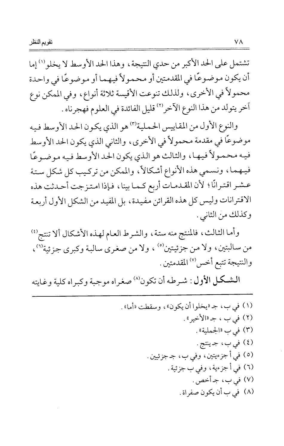 وَالنَّوْع الأول من المقاييس الحملية هُوَ الَّذِي يكون الْحَد الْأَوْسَط فِيهِ مَوْضُوعا فِي مُقَدّمَة مَحْمُولا فِي الْأُخْرَى، وَالثَّانِي الَّذِي يكون الْحَد الْأَوْسَط فِيهِ مَحْمُولا فِيهَا، وَالثَّالِث هُوَ الَّذِي يكون الْحَد الْأَوْسَط فِيهِ مَوْضُوعا فيهمَا، ونسمي هَذِه الْأَنْوَاع أشكالا، والممكن من تركيب كل شكل سِتَّة عشر اقترانا؛ لِأَن الْمُقدمَات أَربع كَمَا بَينا، فَإِذا امتزجت أحدثت هَذِه الاقترانات وَلَيْسَ كل هَذِه الْقَرَائِن مفيدة، بل الْمُفِيد من الشكل الأول أَرْبَعَة وَكَذَلِكَ من الثَّانِي.