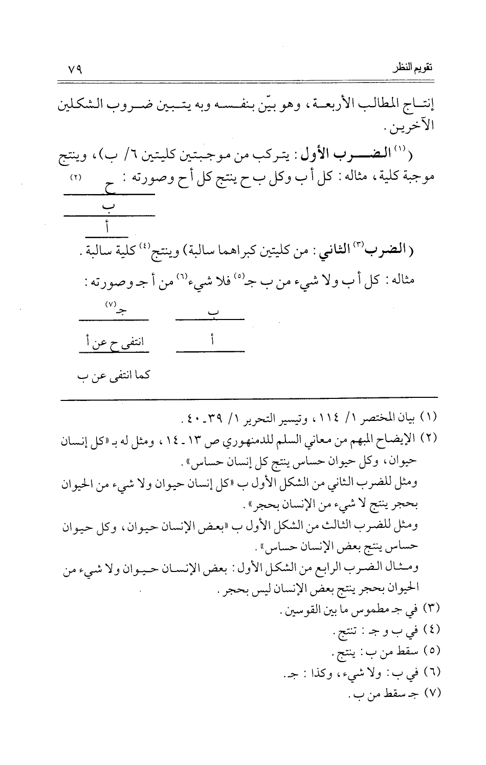 (الضَّرْب الأول: يتركب من موجبتين كلييتين 6 / ب) ، وينتج مُوجبَة كُلية، مِثَاله: كل أَب وكل ب ح ينْتج كل أح وَصورته: