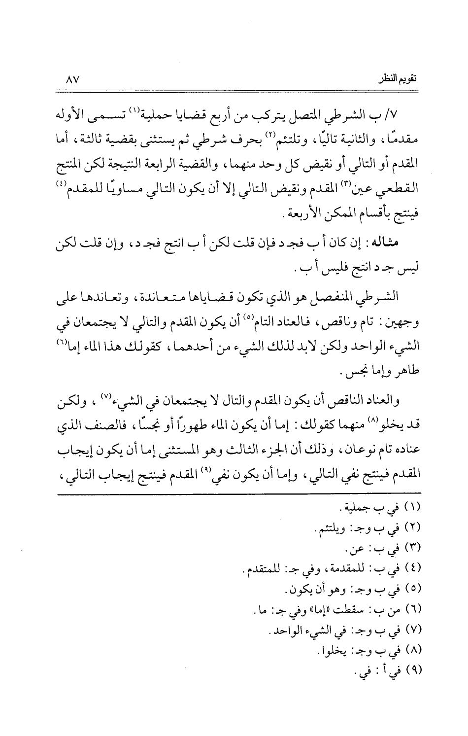7 - / ب الشرطي الْمُتَّصِل يتركب من أَربع قضايا حملية تسمى الأوله مقدما، وَالثَّانيَِة تاليا، وتلتئم بِحرف شرطي ثمَّ يسْتَثْنى بقضية ثَالِثَة، أما الْمُقدم أَو التَّالِي أَو نقيض كل وحد مِنْهُمَا، والقضية الرَّابِعَة النتيجة لَكِن المنتج الْقطعِي عين الْمُقدم ونقيض التَّالِي إِلَّا أَن يكون التَّالِي مُسَاوِيا للمقدم فينتج بأقسام الْمُمكن الْأَرْبَعَة.