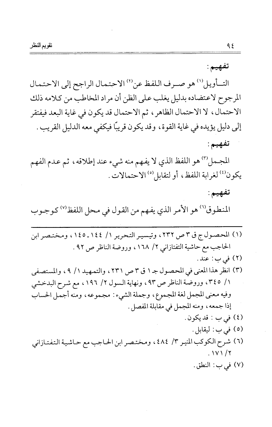 التَّأْوِيل هُوَ صرف اللَّفْظ عَن الِاحْتِمَال الرَّاجِح إِلَى الِاحْتِمَال الْمَرْجُوح لاعتضاده بِدَلِيل يغلب على الظَّن أَن مُرَاد الْمُخَاطب من كَلَامه ذَلِك الِاحْتِمَال، لَا الِاحْتِمَال الظَّاهِر، ثمَّ الِاحْتِمَال قد يكون فِي غَايَة الْبعد فيفتقر إِلَى دَلِيل يُؤَيّدهُ فِي غَايَة الْقُوَّة، وَقد يكون قَرِيبا فَيَكْفِي مَعَه الدَّلِيل الْقَرِيب.