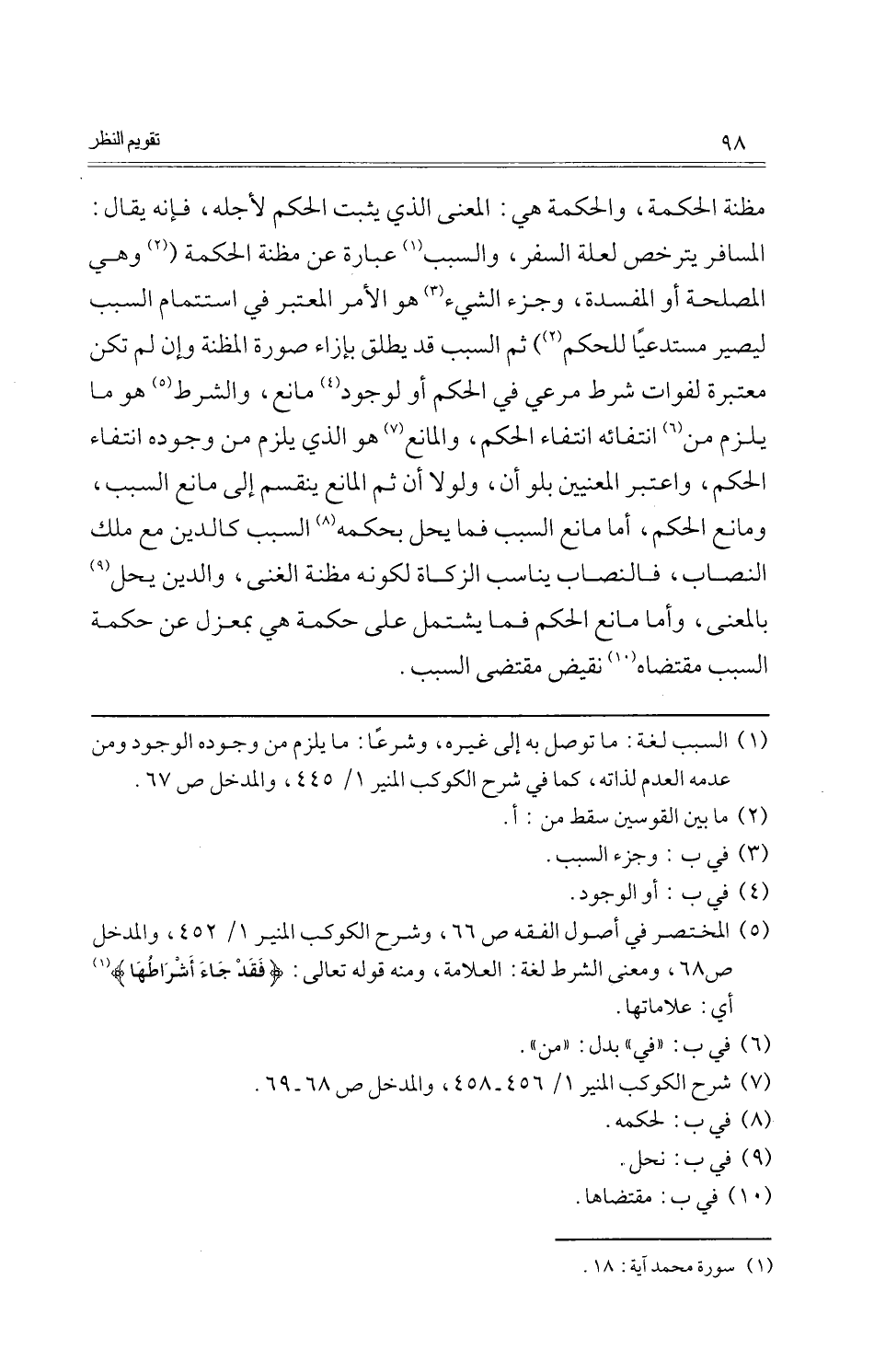 مَظَنَّة الْحِكْمَة، وَالْحكمَة هِيَ: الْمَعْنى الَّذِي يثبت الحكم لأَجله، فَإِنَّهُ يُقَال: الْمُسَافِر يترخص لعِلَّة السّفر، وَالسَّبَب عبارَة عَن مَظَنَّة الْحِكْمَة (وَهِي الْمصلحَة أَو الْمفْسدَة، وجزء الشَّيْء هُوَ الْأَمر الْمُعْتَبر فِي استتمام السَّبَب ليصير مستدعيا للْحكم) ثمَّ السَّبَب قد يُطلق بِإِزَاءِ صُورَة المظنة وَإِن لم تكن مُعْتَبرَة لفَوَات شَرط مرعي فِي الحكم أَو لوُجُود مَانع، وَالشّرط هُوَ مَا يلْزم من انتفائه انْتِفَاء الحكم، وَالْمَانِع هُوَ الَّذِي يلْزم من وجوده انْتِفَاء الحكم، وَاعْتبر الْمَعْنيين بلو أَن، وَلَوْلَا أَن ثمَّ الْمَانِع يَنْقَسِم إِلَى مَانع السَّبَب، ومانع الحكم، أما مَانع السَّبَب فَمَا يحل بِحكمِهِ السَّبَب كَالدّين مَعَ ملك النّصاب، فالنصاب يُنَاسب الزَّكَاة لكَونه مَظَنَّة الْغنى، وَالدّين يحل بِالْمَعْنَى، وَأما مَانع الحكم فَمَا يشْتَمل على حِكْمَة هِيَ بمعزل عَن حِكْمَة السَّبَب مُقْتَضَاهُ نقيض مُقْتَضى السَّبَب.