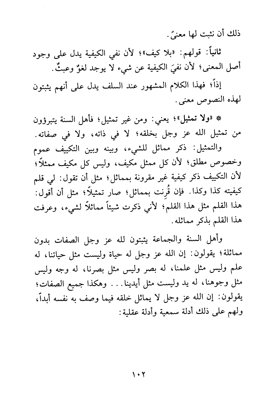 ثانياً: قوله: "بلا كيف" لأن نفي الكيفية يدل على وجود أصل المعنى، لأن نفي الكيفية عن شيء لا يوجد لغو وعبث.