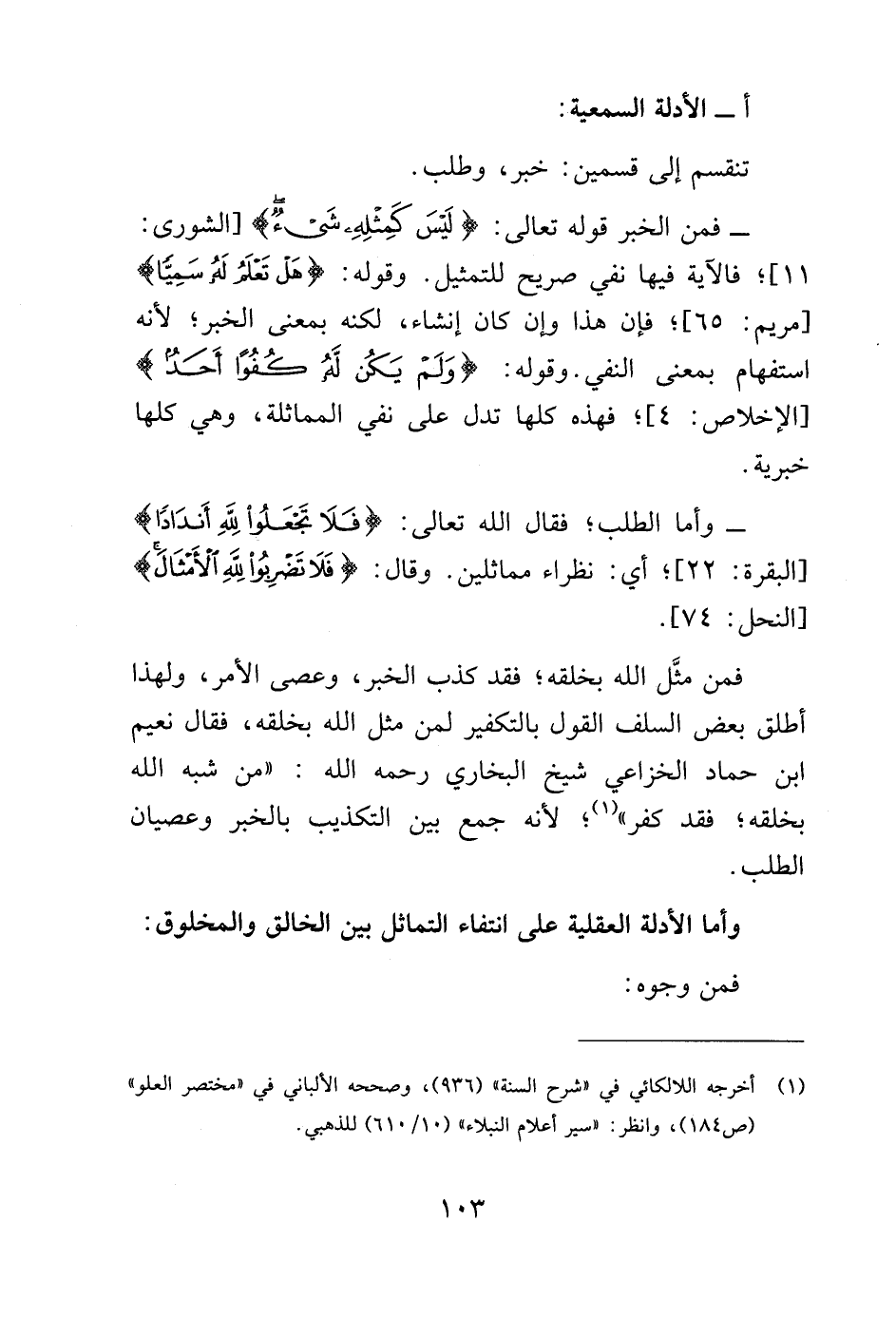 - فمن الخبر قوله تعالى: {لَيْسَ كَمِثْلِهِ شَيْءٌ} [الشورى: 11]، فالآية فيها نفي صريح للتمثيل وقوله: {هَلْ تَعْلَمُ لَهُ سَمِيّاً} [مريم: 65]، فإن هذا وإن كان إنشاء، لكنه بمعنى الخبر، لأنه استفهام بمعنى النفي وقوله: {وَلَمْ يَكُنْ لَهُ كُفُواً أَحَدٌ} [الإخلاص: 4]، فهذه كلها تدل على نفي المماثلة، وهي كلها خبرية.