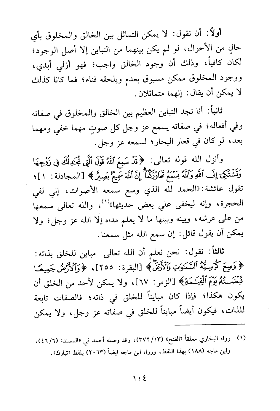 أولاً: أن نقولك لا يمكن التماثل بين الخالق والمخلوق بأي حال من الأحوال لو لم يكن بينهما من التباين إلا أصل الوجود، لكان كافياً، وذلك أن وجود الخالق واجب، فهو أزلي أبدي، ووجود المخلوق ممكن مسبوق بعدم ويلحقه فناء، فما كانا كذلك لا يمكن أن يقال: إنهما متماثلان.