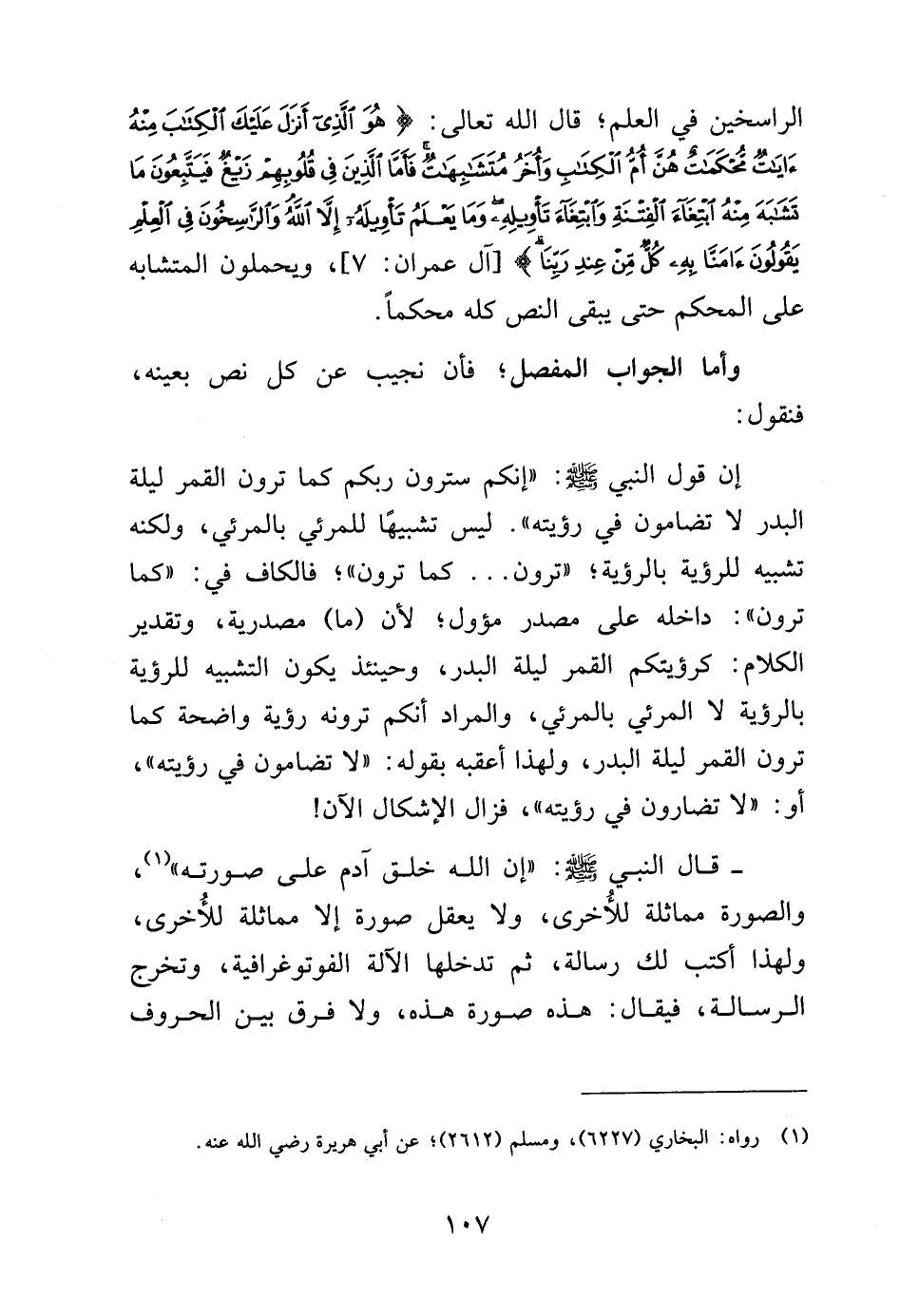 إن قول النبي صلى الله عليه وسلم: "إنكم سترون ربكم كما ترون القمر ليلة البدر لا تضامون في رؤيته" ليس تشبيهاً للمرئي بالمرئي، ولكنه تشبيه للرؤية بالرؤية، "سترون ... كما ترون"، فالكاف في: "كما ترون": داخله على مصدر مؤول، لأن (ما) مصدرية، وتقدير الكلام: كرؤيتكم القمر ليلة البدر وحينئذ يكون التشبيه للرؤية بالرؤية لا المرئي بالمرئي، والمراد أنكم ترونه رؤية واضحة كما ترون القمر ليلة البدر ولهذا أعقبه بقوله: "لا تضامون في رؤيته" أو: "لا تضارون في رؤيته" فزال الإشكال الآن.