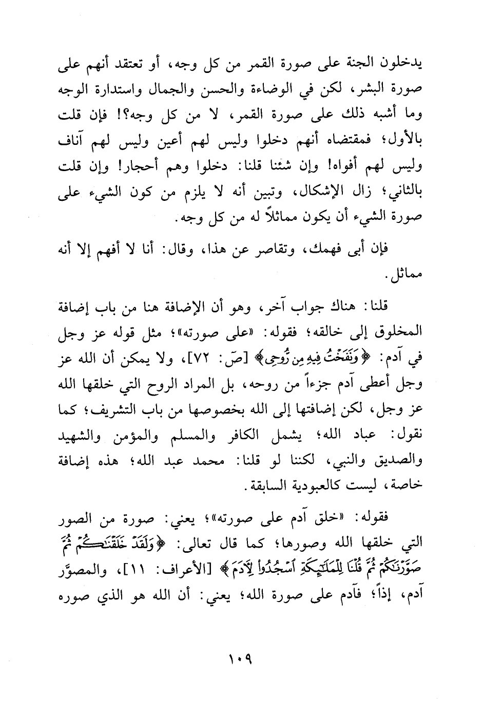 قلنا: هناك جواب آخر، وهو أن الإضافة هنا من باب إضافة المخلوق إلى خالقه، فقوله: "على صورته"، مثل قوله عزوجل في آدم: {وَنَفَخْتُ فِيهِ مِنْ رُوحِي} [ص: 72]، ولا يمكن أن الله عز وجل أعطى آدم جزءاً من روحه، بل المراد الروح التي خلقها الله عز وجل، لكن إضافتها إلى الله بخصوصها من باب التشريف، كما نقول: عباد الله، يشمل الكافر والمسلم والمؤمن والشهيد والصديق والنبي لكننا لو قلنا: محمد عبد الله، هذه إضافة خاصة ليست كالعبودية السابقة.