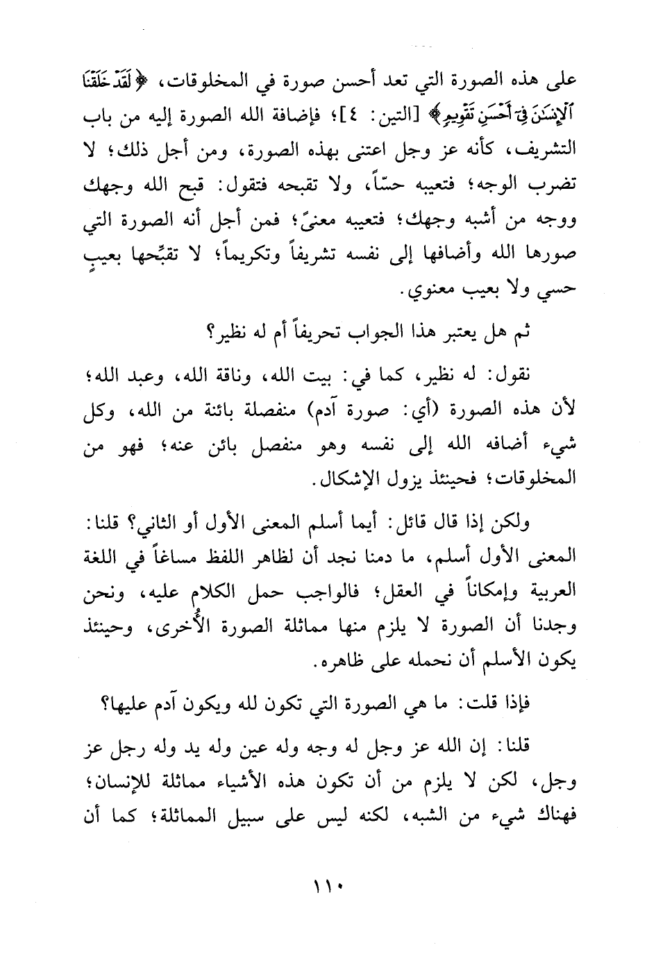 على هذه الصورة التي تعد أحسن صورة في المخلوقات، {لَقَدْ خَلَقْنَا الأِنْسَانَ فِي أَحْسَنِ تَقْوِيمٍ} [التين: 4]، فإضافة الله الصورة إليه من باب التشريف، كأنه عز وجل اعتنى بهذه الصورة ومن أجل ذلك، لا تضرب الوجه، فتعيبه حساً، ولا تقبحه فتقول: قبح الله وجهك ووجه من أشبه وجهك، فتعيبه معنى، فمن أجل أنه الصورة التي صورها الله وأضافها إلى نفسه تشريفاً وتكريماً، لا تقبحها بعيب حسي ولا بعيب معنوي.