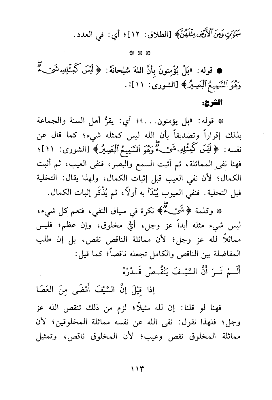 * قوله: "بل يؤمن بأن الله سبحانه {لَيْسَ كَمِثْلِهِ شَيْءٌ وَهُوَ السَّمِيعُ الْبَصِيرُ} [الشورى: 11] ".