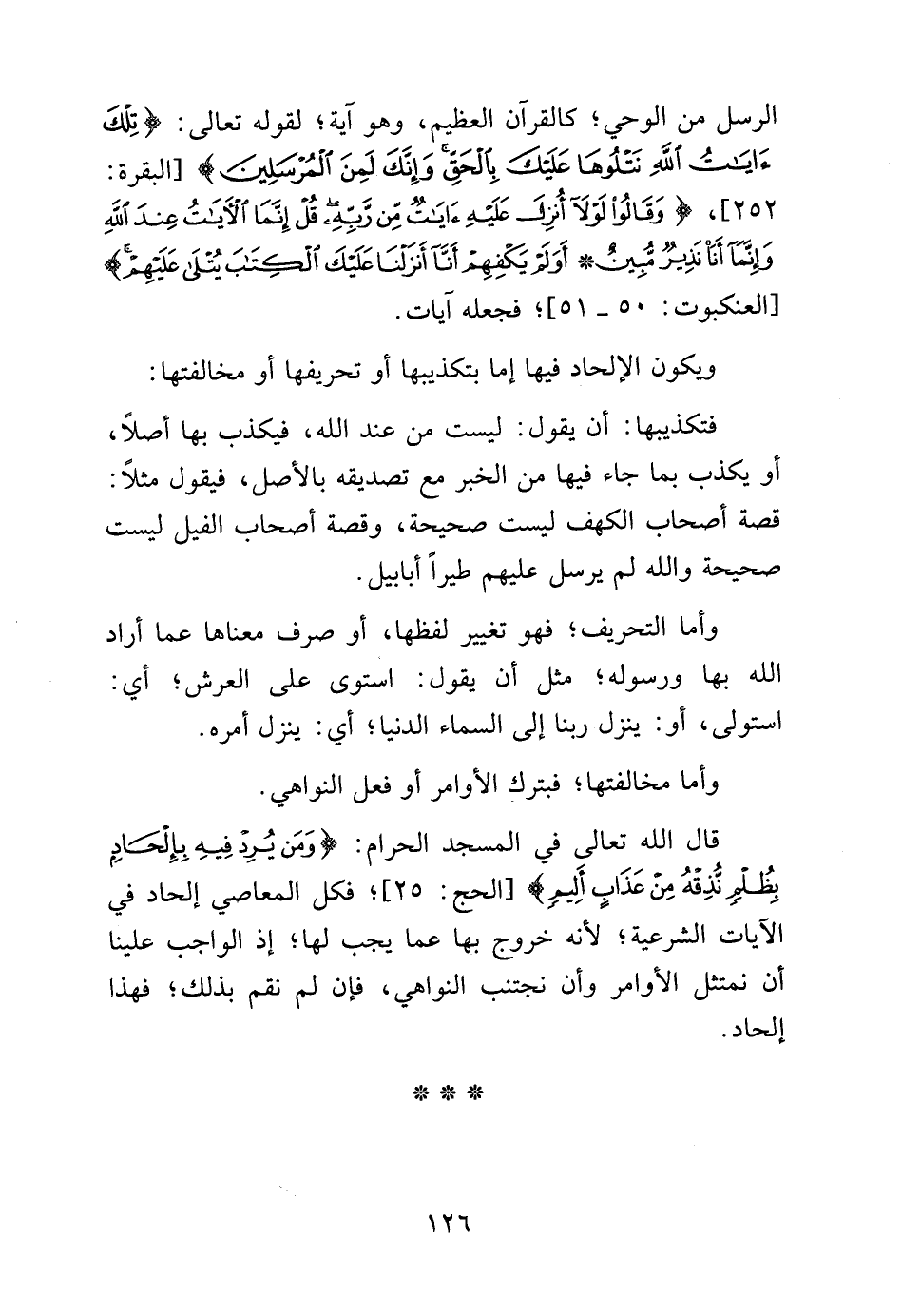قال الله تعالى في المسجد الحرام: {وَمَنْ يُرِدْ فِيهِ بِإِلْحَادٍ بِظُلْمٍ نُذِقْهُ مِنْ عَذَابٍ أَلِيمٍ} [الحج: 25]، فكل المعاصي إلحاد في الآيات الشرعية، لأنه خروج بها عما يجب لها، إذ الواجب علينا أن نتمثل الأوامر وأن نجتنب النواهي، فإن لم نقم بذلك، فهذا إلحاد.