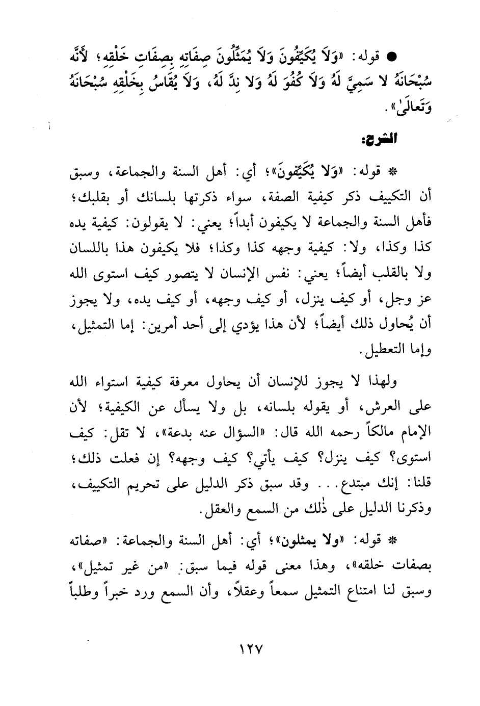 * قوله: "ولا يكيفون ولا يمثلون صفاته بصفات خلقه؛ لأنه سبحانهلا سمي له وكفو له ولا ند له, بخلقه سبحانه وتعالى".