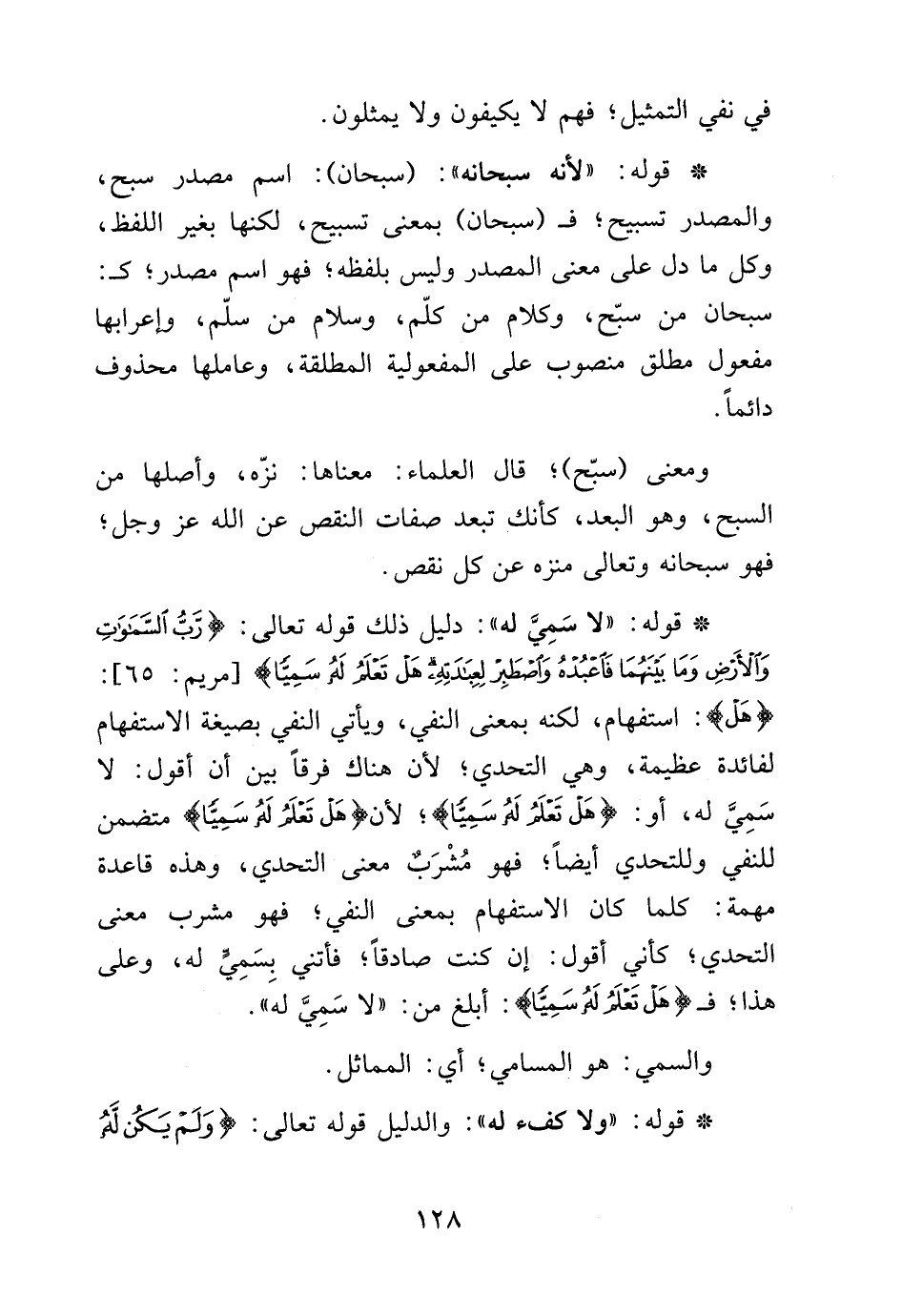 قوله: "لا سمي له": دليل ذلك قوله تعالى: {رَبُّ السَّمَاوَاتِ وَالأَرْضِ وَمَا بَيْنَهُمَا فَاعْبُدْهُ وَاصْطَبِرْ لِعِبَادَتِهِ هَلْ تَعْلَمُ لَهُ سَمِيّاً} [مريم: 65]: {هَلْ} استفهام، لكنه بمعنى النفي ويأتي النفي بصيغة الاستفهام لفائدة عظيمة، وهي التحدي، لأن هناك فرقاً بين أن أقول: لا سمي له، و: {هَلْ تَعْلَمُ لَهُ سَمِيّاً}، لأن {هَلْ تَعْلَمُ لَهُ سَمِيّاً} متضمن للنفي وللتحدي أيضاً، مُشرَب معنى التحدي، وهذه قاعدة مهمة: كلما كان الاستفهام بمعنى النفي، فهو مشرب معنى التحدي، كأني أقول: إن كنت صادقاً، فأتني بسمي له وعلى هذا، فـ {هَلْ تَعْلَمُ لَهُ سَمِيّاً}: أبلغ من: "لا سميّ له".