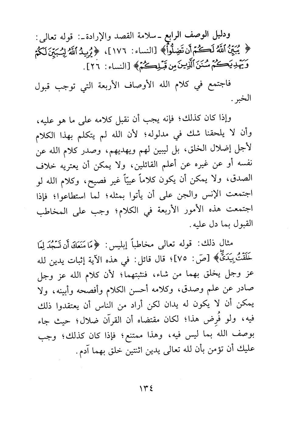 وإذا كان كذلك، فإنه يجب أن نقبل كلامه على ما هو عليه، وأن لا يلحقنا شك في مدلوله، لأن الله لم يتكلم بهذا الكلام لأجل إضلال الخلق، بل ليبين لهم ويهديهم، وصدر كلام الله عن نفسه أو عن غيره من أعلم القائلين، ولا يمكن أن يعتريه خلاف الصدق، ولا يمكن أن يكون كلاماً عيياً غير فصيح، وكلام الله لو اجتمعت هذه الأمور الأربعة في الكلام، وجب عل المخاطب القبول بما دل عليه.