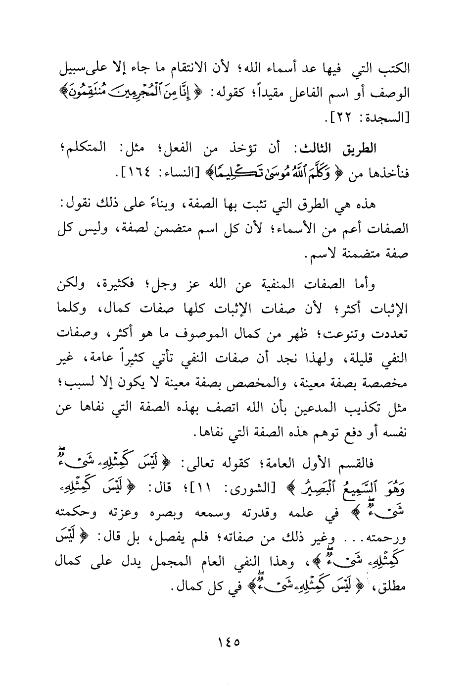 فالقسم الأول العامة، كقوله تعالى: {لَيْسَ كَمِثْلِهِ شَيْءٌ وَهُوَ السَّمِيعُ الْبَصِيرُ} [الشورى: 11]، قال: {لَيْسَ كَمِثْلِهِ شَيْءٌ} في علمه وقدرته وسمعه وبصره وعزته وحكمته ورحمته .. وغير ذلك من صفاته، فلم يفصل، بل قال: {لَيْسَ كَمِثْلِهِ شَيْءٌ} في كل كمال.