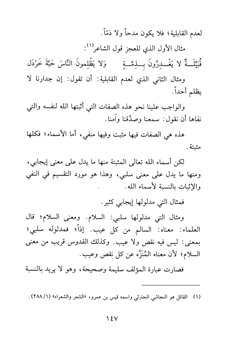 ومثال التي مدلولها سلبي: السلام. ومعنى السلام، قال العلماء: معناه: السالم من كل عيب. إذاً، فمدلوله سلبي، بمعنى: ليس فيه نقص ولا عيب، وكذلك القدوس قريب من معنى السلام، لأن معناه المنزه عن كل نقص وعيب.