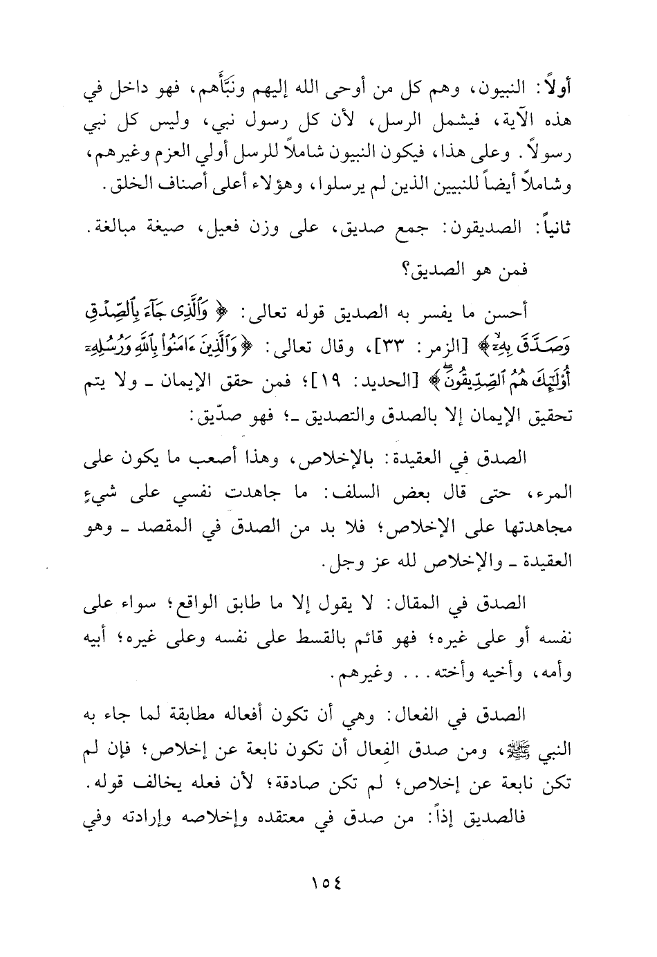 أحسن ما يفسر به الصديق قوله تعالى: {وَالَّذِي جَاءَ بِالصِّدْقِ وَصَدَّقَ بِهِ} [الزمر: 33]، وقال تعالى {وَالَّذِينَ آمَنُوا بِاللَّهِ وَرُسُلِهِ أُولَئِكَ هُمُ الصِّدِّيقُونَ} [الحديد: 19]، فمن حقق الإيمان ـ ولا يتم تحقيق الإيمان إلا بالصدق والتصديق ـ فهو صديق: