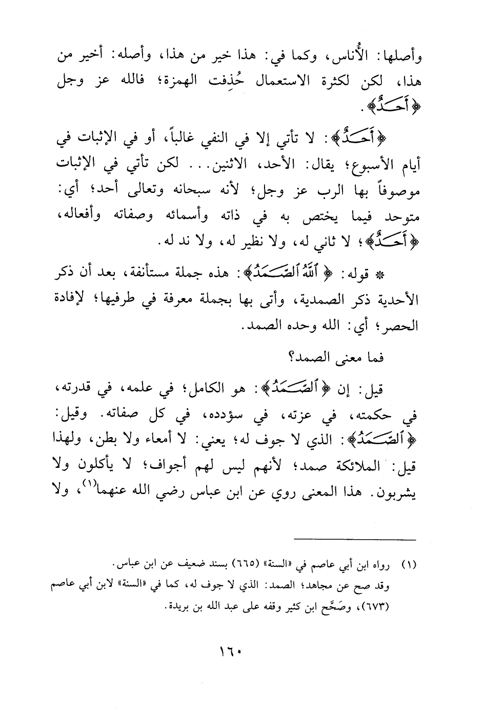 قيل: إن {الصَّمَدُ}: هو الكامل، في علمه في قدرته، في حكمته، في عزته، في سؤدده، في كل صفاته. وقيل: {الصَّمَدُ}: الذي لا جوف له، يعني لا أمعاء ولا بطن، ولهذا قيل: الملائكة صمد، لأنهم ليس لهم أجواف، لا يأكلون ولا يشربون. هذا المعنى روي عن ابن عباس رضي الله عنهما (¬1) , ولا