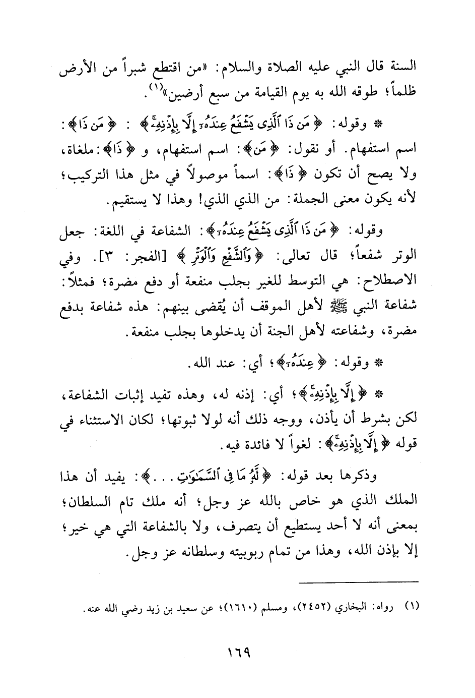 وقوله: {مَنْ ذَا الَّذِي يَشْفَعُ عِنْدَهُ} الشفاعة في اللغة: جعل الوتر شفعاً، قال تعالى: {وَالشَّفْعِ وَالْوَتْرِ} [الفجر: 3]. وفي الاصطلاح: هي التوسط للغير بجلب منفعة أو دفع مضرة، فمثلاً: شفاعة النبي صلى الله عليه وسلم لأهل الموقف أن يقضى بينهم: هذه شفاعة بدفع مضرة، وشفاعته لأهل الجنة أن يدخلوها بجلب منفعة.