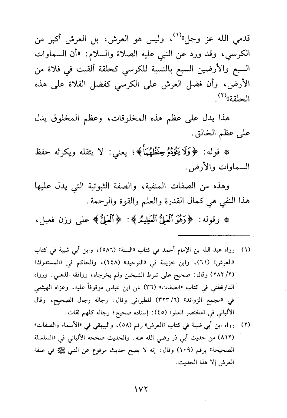 (¬1) رواه عبد الله بن الإمام أحمد في كتاب "السنة" (586)، وابن أبي شيبة في كتاب "العرش" (61)، وابن خزيمة في "التوحيد" (248)، والحاكم في "المستدرك" (2/ 282) وقال: صحيح عن شرط الشيخين ولم يخرجاه، ووافقه الذهبي، ورواه الدارقطني في كتاب "الصفات" (36) عن ابن عباس موقوفاً عليه، وعزاه الهيثمي في "مجمع الزوائد" (6/ 323) للطبراني، وقال: رجاله رجال الصحيح، وقال الألباني في "مختصر العلو" (45): إسناده صحيح، رجاله كلهم ثقات.