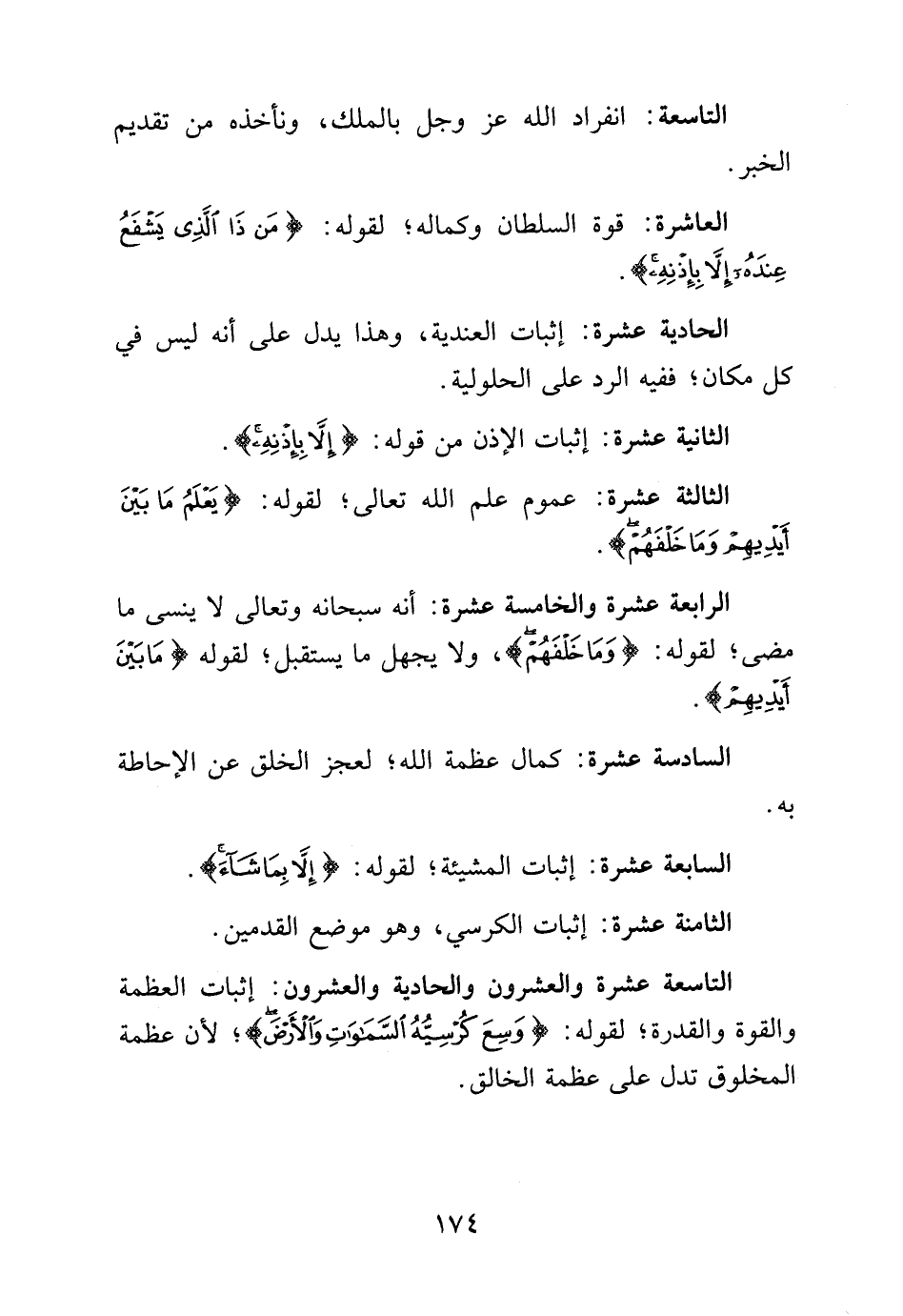 العاشرة: قوة السلطان وكماله، لقوله: {مَنْ ذَا الَّذِي يَشْفَعُ عِنْدَهُ إِلاّ بِإِذْنِهِ}.
