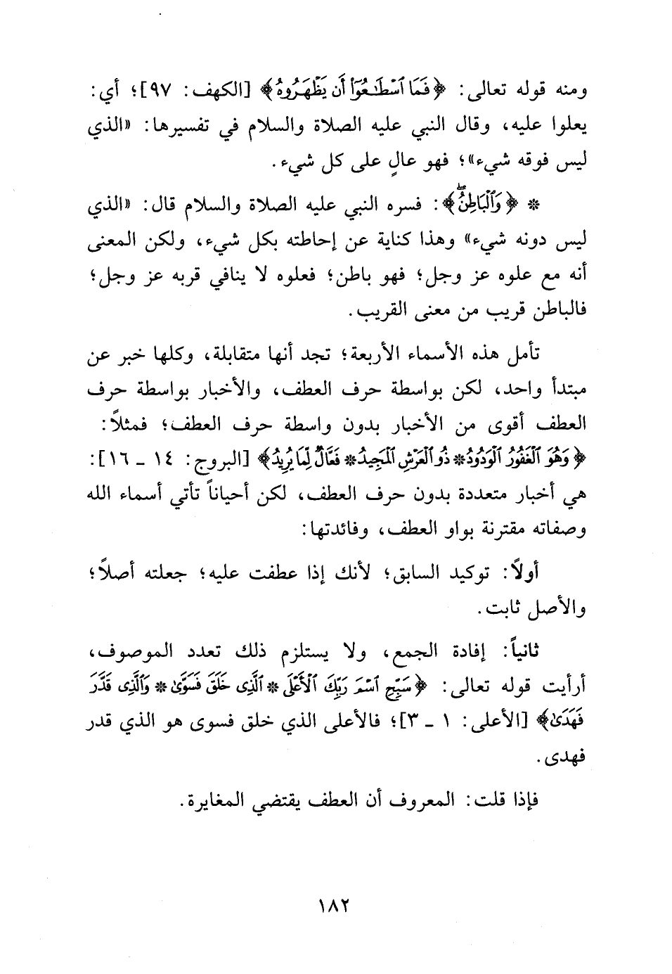 تأمل هذه الأسماء الأربعة، تجد أنها متقابله، وكلها خبر عن مبتدأ واحد لكن بواسطة حرف العطف والأخبار بواسطة حرف العطف أقوى من الأخبار بدون واسطة حرف العطف، فمثلاً: {وَهُوَ الْغَفُورُ الْوَدُودُ ذُو الْعَرْشِ الْمَجِيدُ فَعَّالٌ لِمَا يُرِيدُ} [البروج: 14 - 16]: هي أخبار متعددة بدون حرف العطف لكن أحياناً تأتي أسماء الله وصفاته مقترنة بواو العطف وفائدتها: