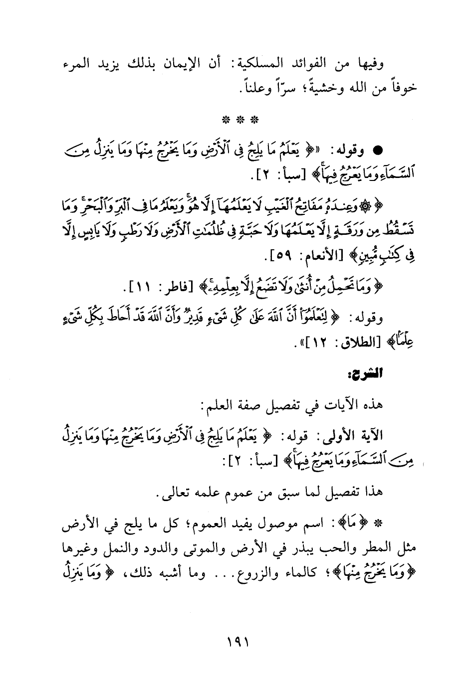 الآية الأولى: قوله: {يَعْلَمُ مَا يَلِجُ فِي الْأَرْضِ وَمَا يَخْرُجُ مِنْهَا وَمَا يَنْزِلُ مِنَ السَّمَاءِ وَمَا يَعْرُجُ فِيهَا} [سبأ: 2]: