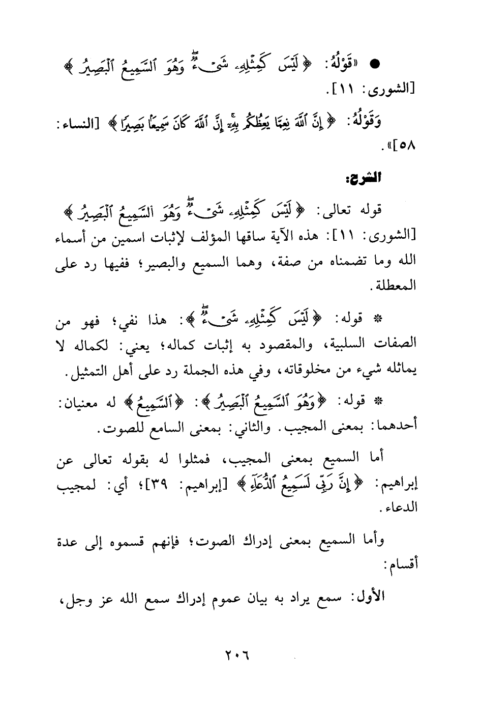وقوله: {لَيْسَ كَمِثْلِهِ شَيْءٌ وَهُوَ السَّمِيعُ الْبَصِيرُ} [الشورى: 11]. هذه الآية ساقها المؤلف إثبات اسمين من أسماء الله وما تضمناه من صفة، وهما السميع والبصير، ففيها رد على المعطلة.