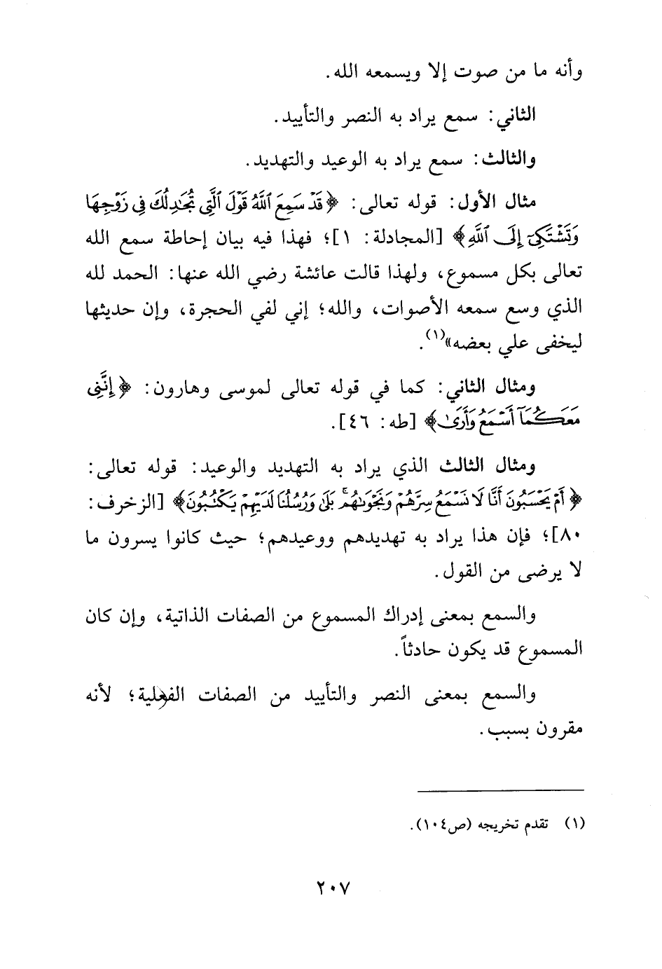 مثال الأول: قوله تعالى: {قَدْ سَمِعَ اللَّهُ قَوْلَ الَّتِي تُجَادِلُكَ فِي زَوْجِهَا وَتَشْتَكِي إِلَى اللَّهِ} [المجادلة: 1]، فهذا فيه بيان إحاطة سمع الله تعالى بكل مسموع، ولهذا قالت عائشة رضي الله عنها: "الحمد لله الذي وسع سمعه الأصوات، والله إني لفي الحجرة، وإن حديثها ليخفى على بعضه" (¬1).