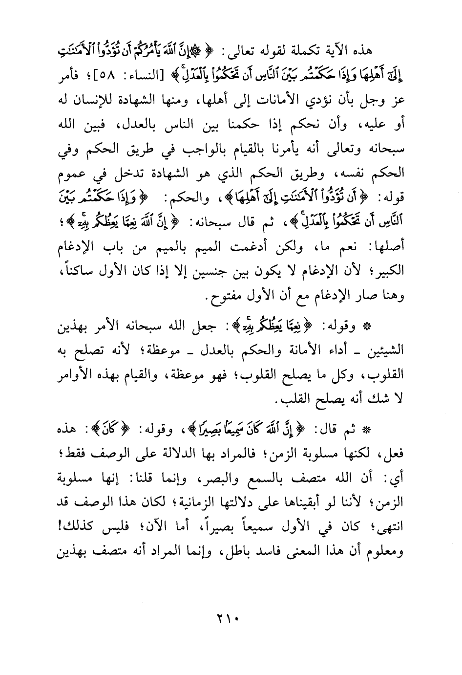 هذه الآية تكملة لقوله تعالى: {إِنَّ اللَّهَ يَأْمُرُكُمْ أَنْ تُؤَدُّوا الأَمَانَاتِ إِلَى أَهْلِهَا وَإِذَا حَكَمْتُمْ بَيْنَ النَّاسِ أَنْ تَحْكُمُوا بِالْعَدْلِ} [النساء: 58]، فأمر عز وجل بأن نؤدي الأمانات إلى أهلها، ومنها الشهادة للإنسان له أو عليه، وأن نحكم إذا حكمنا بين الناس بالعدل، فبين الله سبحانه وتعالى أنه يأمرنا بالقيام بالواجب في طريق الحكم وفي الحكم نفسه، وطريق الحكم الذي هو الشهادة تدخل في عموم قوله: {أَنْ تُؤَدُّوا الأَمَانَاتِ إِلَى أَهْلِهَا}، والحكم: {وَإِذَا حَكَمْتُمْ بَيْنَ النَّاسِ أَنْ تَحْكُمُوا بِالْعَدْلِ}، ثم قال سبحانه: {إِنَّ اللَّهَ نِعِمَّا يَعِظُكُمْ بِهِ}، أصلها: نعم ما ولكن ادغمت الميم بالميم من باب الإدغام الكبير، لأن الإدغام لا يكون بين جنسين إلا إذا كان الأول ساكناً، وهنا صار الإدغام مع أن الأول مفتوح.