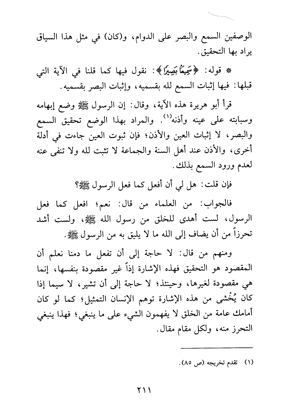 قرأ أبو هريرة هذه الآية، وقال: إن الرسول صلى الله عليه وسلم وضع إبهامه وسبابته على عينه وأذنه (¬1). والمراد بهذا الوضع تحقيق السمع والبصر، لا إثبات العين والأذن، فإن ثبوت العين جاءت في أدلة أخرى، والأذن عند أهل السنة والجماعة لا تثبت لله ولا تنفى عنه لعدم ورود السمع بذلك.