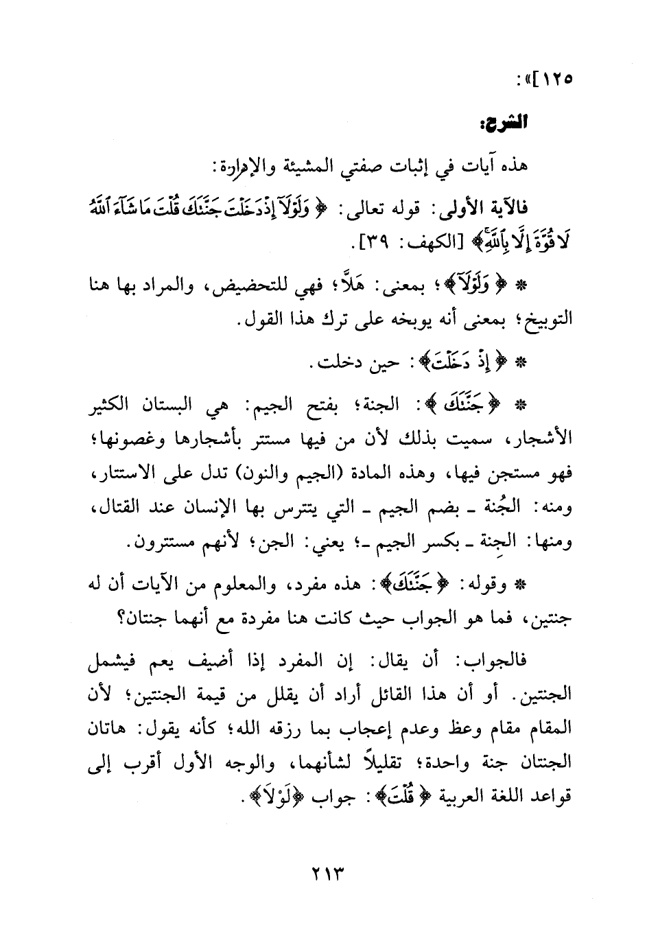 الجواب: أن يقال: إن المفرد إذا أضيف يعم فيشمل الجنتين. أو أن هذا القائل أراد أن يقلل من قيمة الجنتين، لأن المقام مقام وعظ وعدم إعجاب بما رزقه الله، كأنه يقول: هاتان الجنتان جنة واحدة، تقليلاً لشأنهما، والوجه الأول أقرب إلى قواعد اللغة العربية {قُلْتَ}: جواب {لَوْلا}.