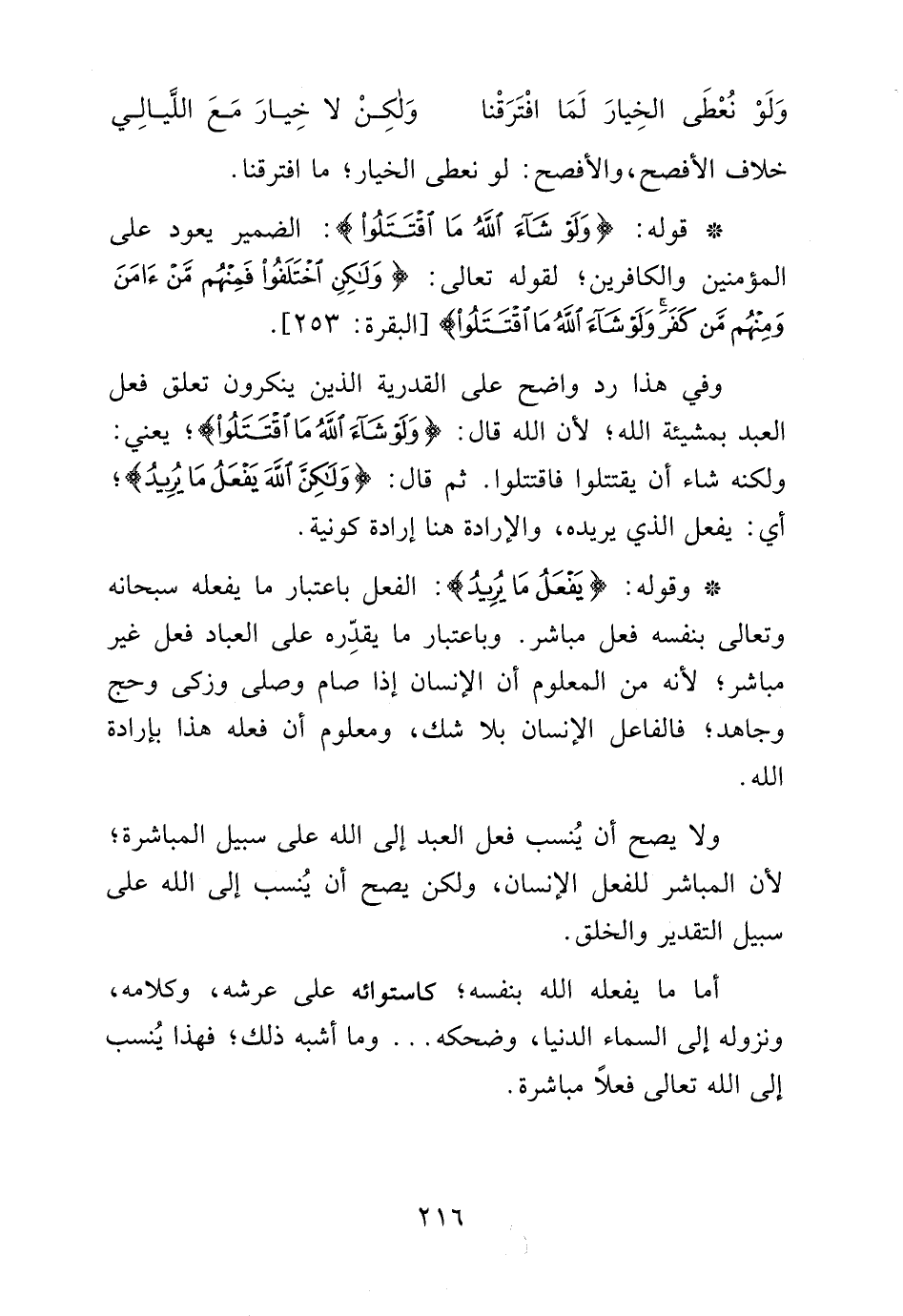وفي هذا رد واضح على القدرية الذي ينكرون تعلق فعل العبد بمشيئة الله، لأن الله قال: {وَلَوْ شَاءَ اللَّهُ مَا اقْتَتَلُوا}، يعني: ولكنه شاء أن يقتتلوا فاقتتلوا. ثم قال: {وَلَكِنَّ اللَّهَ يَفْعَلُ مَا يُرِيدُ}، أي: يفعل الذي يريده، والإرادة هنا إرادة كونية.