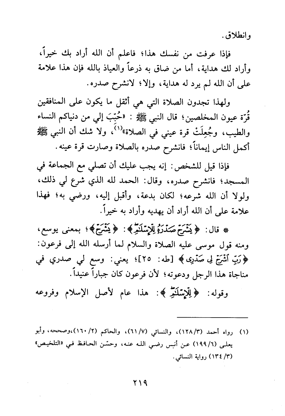ولهذا تجدون الصلاة التي هي أثقل ما يكون على المنافقين قرة عيون المخلصين، قال النبي صلى الله عليه وسلم: "حبب إلى ما دنياكم النساء والطيب، وجعلت قرة عيني في الصلاة" (¬1)، ولا شك أن النبي صلى الله عليه وسلم أكمل الناس إيماناً، فانشرح صدره بالصلاة وصارت قرة عينه.