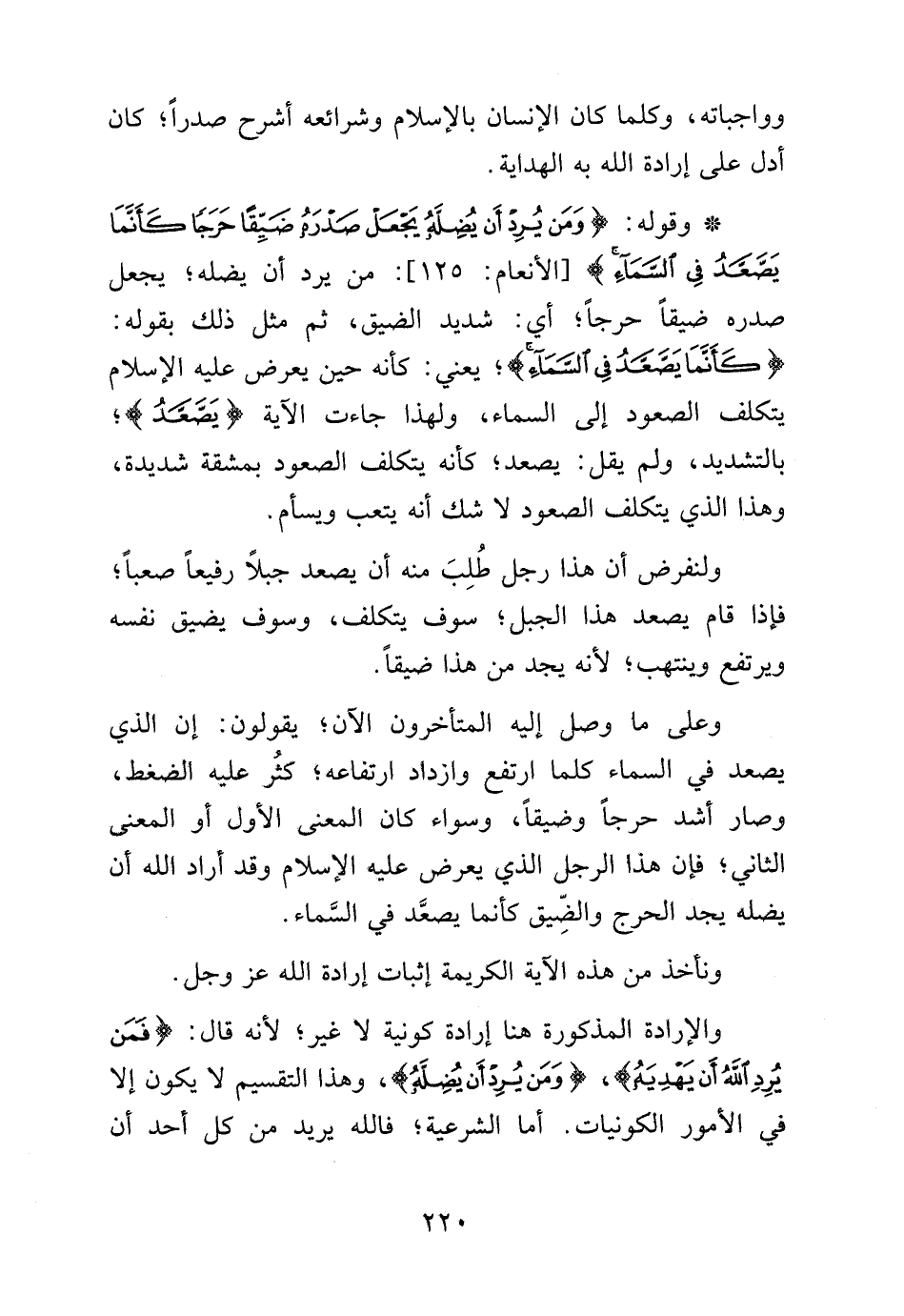 وقوله: {وَمَنْ يُرِدْ أَنْ يُضِلَّهُ يَجْعَلْ صَدْرَهُ ضَيِّقاً حَرَجاً كَأَنَّمَا يَصَّعَّدُ فِي السَّمَاءِ}: من يرد أن يضله: {كَأَنَّمَا يَصَّعَّدُ فِي السَّمَاءِ}، يعني: كأنه حين يعرض عليه الإسلام يتكلف الصعود إلى السماء، ولهذا جاءت الآية: {يَصَّعَّدُ}، بالتشديد، ولم يقل: يصعد، كأنه يتكلف الصعود بمشقة شديدة، وهذا الذي يتكلف الصعود لا شك أنه يتعب ويسأم.