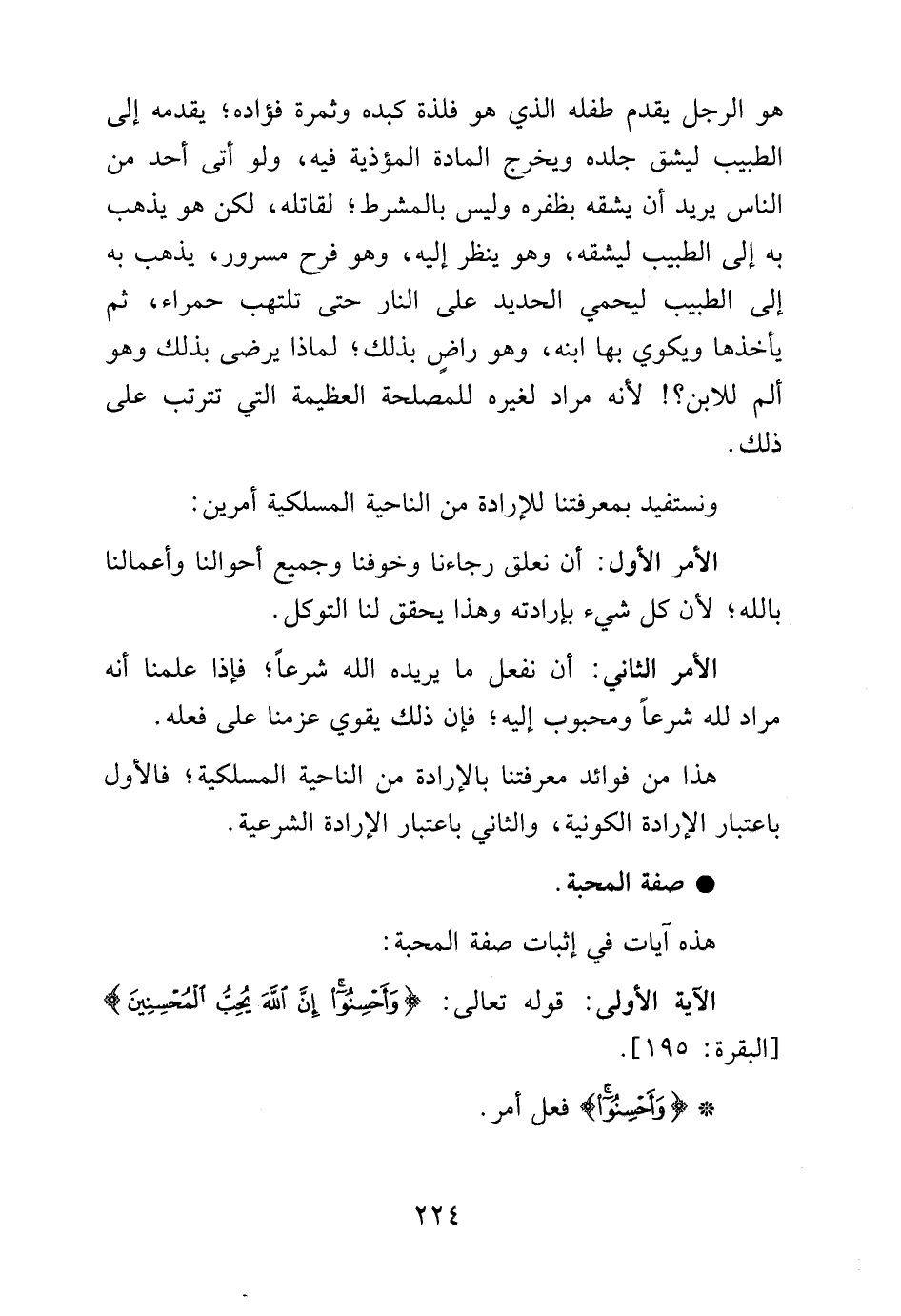 هو الرجل يقدم طفله الذي هو فلذة كبده وثمرة فؤاده، يقدمه إلى الطبيب ليشق جلده ويخرج المادة المؤذية فيه ولو أتى أحد من الناس يريد أن يشقه بظفره وليس بالمشرط، لقاتله، لكن هو يذهب إلى الطبيب ليشقه، وهو ينظر إليه، وهو فرح مسرور، يذهب به إلى الطبيب ليحمي الحديد على النار حتى تلتهب حمراء، ثم يأخذها ويكوي بها ابنه، وهو راض بذلك، لماذا يرضى بذلك وهو ألم للابن؟ لأنه مراد لغيره للمصلحة العظيمة التي تترتب على ذلك.