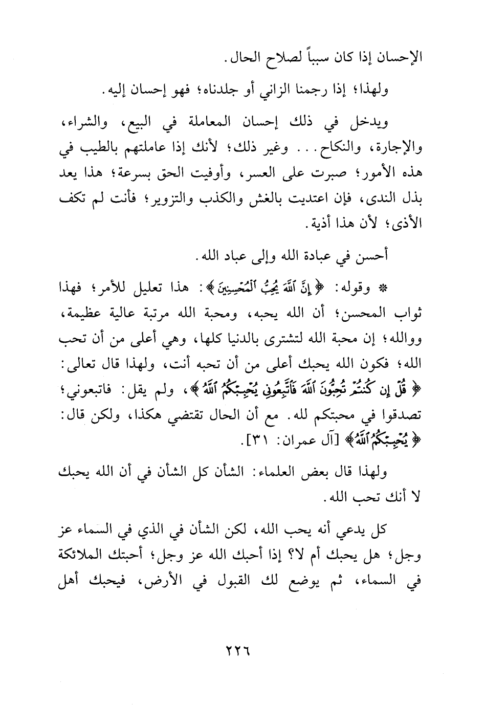 وقوله: {إِنَّ اللَّهَ يُحِبُّ الْمُحْسِنِين}: هذا تعليل للأمر، فهذا ثواب المحسن، أن الله يحبهن ومحبة الله مرتبة عالية عظيمة، ووالله إن محبة الله لتشترى بالدنيا كلها، وهي أعلى من أن تحب الله، فكون الله يحبك أعلى من أن تحبه أنت، ولهذا قال تعالى: {قُلْ إِنْ كُنْتُمْ تُحِبُّونَ اللَّهَ فَاتَّبِعُونِي يُحْبِبْكُمُ اللَّهُ}، ولم يقل: فاتبعوني، تصدقوا في محبتكم لله. مع أن الحال تقتضي هكذا، ولكن قال: {يُحْبِبْكُمُ اللَّهُ} [آل عمران: 31].