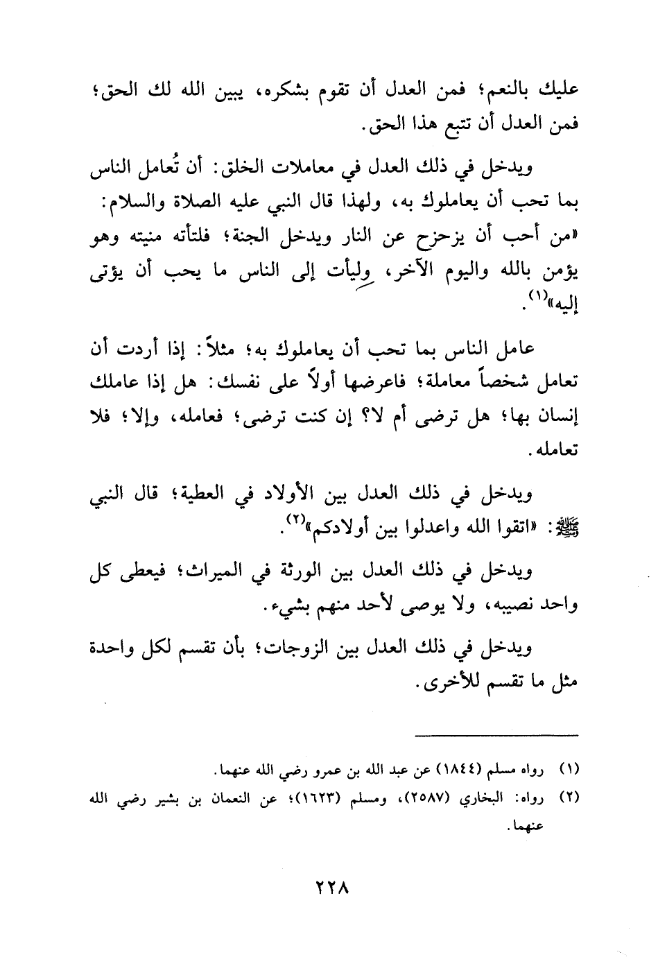 ويدخل في ذلك العدل في معاملات الخلق: أن تعامل الناس بما تحب أن يعاملوك به، ولهذا قال النبي عليه الصلاة والسلام: "من أحب أن يزحزح عن النار ويدخله الجنة، فلتأته منيته وهو يؤمن بالله واليوم الآخر، وليأت إلى الناس ما يجب أن يؤتي إليه" (¬1).