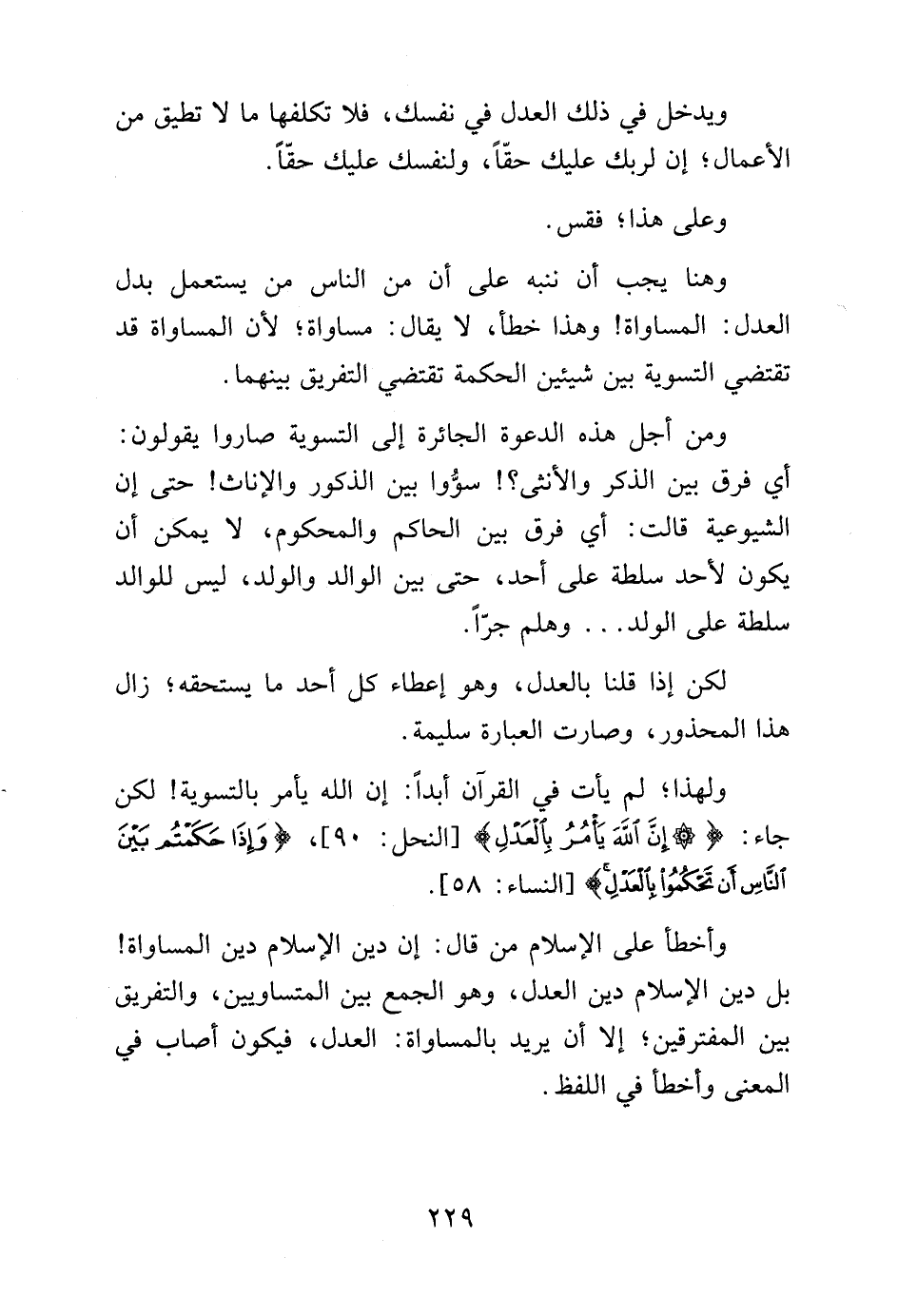 وأخطأ على الإسلام من قال: إن دين الإسلام دين المساواة! بل دين الإسلام دين العدل، وهو الجمع بين المتساويين، والتفريق بين المفترقين، إلا أن يريد بالمساواة: العدل، فيكون أصاب في المعنى وأخطأ في اللفظ.