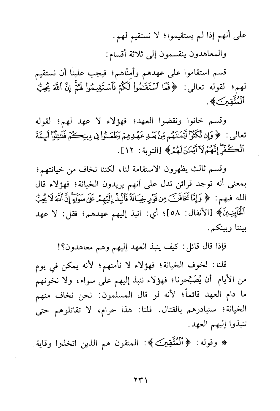 وقسم ثالث يظهرون الاستقامة لنا، لكننا نخاف من خيانتهم، بمعنى أنه توجد قرائن تدل على أنهم يريدون الخيانة، فهؤلاء قال الله فيهم: {وَإِمَّا تَخَافَنَّ مِنْ قَوْمٍ خِيَانَةً فَانْبِذْ إِلَيْهِمْ عَلَى سَوَاءٍ إِنَّ اللَّهَ لا يُحِبُّ الْخَائِنِينَ} [الأنفال: 58]، أي: انبذ إليهم عهدهم، فقل: لا عهد بيننا وبينكم.